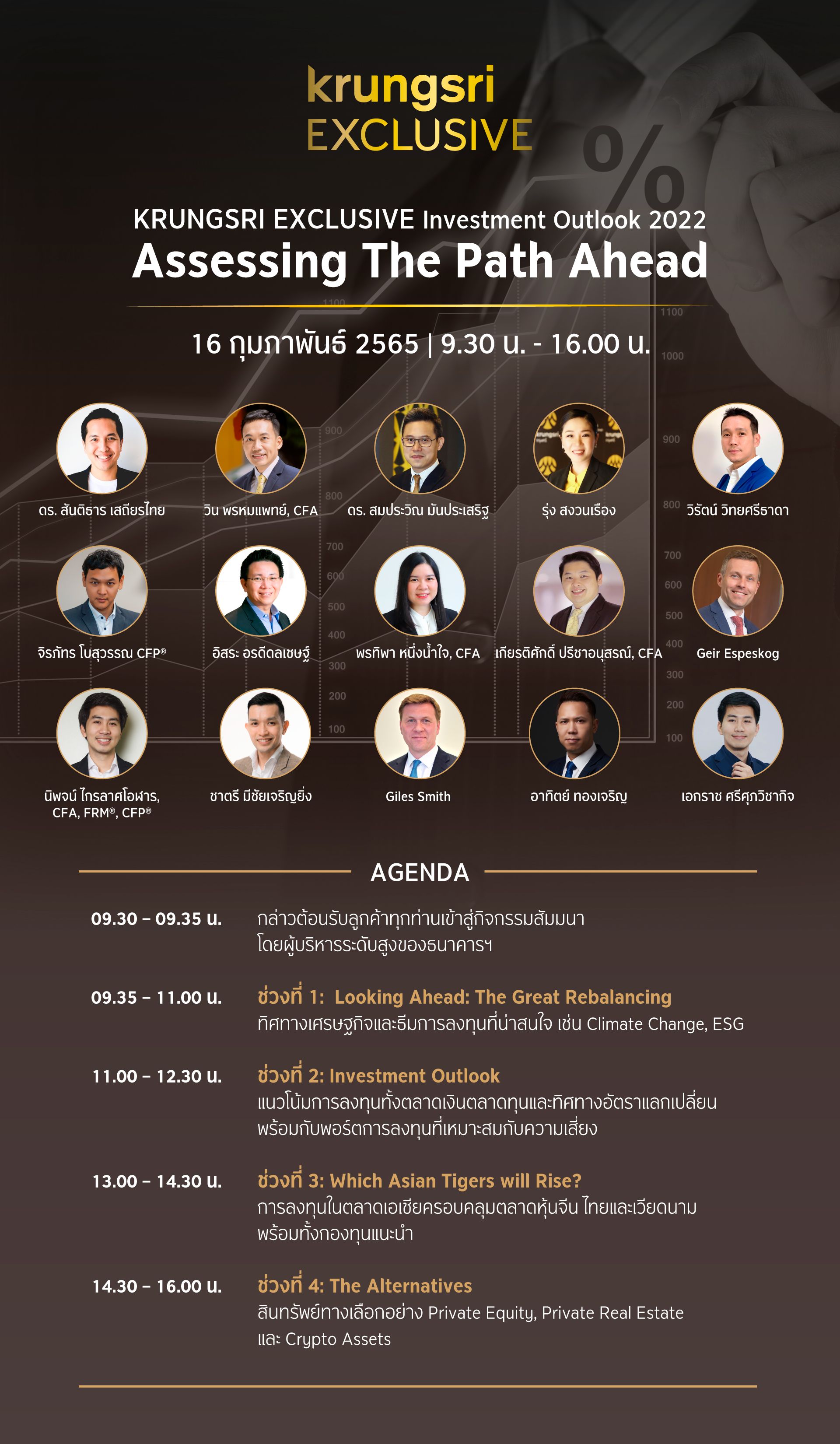 นอกจากนี้ กรุงศรียังได้เตรียมจัดงานสัมมนา KRUNGSRI EXCLUSIVE Investment Outlook 2022: Assessing the Path Ahead ในวันที่ 16 กุมภาพันธ์ 2565 โดยรวบรวมกูรูด้านเศรษฐกิจและการลงทุนทั้งจากในกลุ่มกรุงศรีและพันธมิตรทางธุรกิจถึง 10 ท่าน มาร่วมปูทางให้เห็นภาพเศรษฐกิจและทิศทางการลงทุนในปี 2565 โดยการสัมมนาแบ่งออกเป็น 4 ช่วง 4 หัวข้อที่น่าสนใจ ลูกค้าสามารถศึกษารายละเอียดเพิ่มเติมและลงทะเบียนเข้าร่วมสัมมนาได้ที่ https://www.krungsri.com/th/campaigns/kse-investment-outlook-2022-press-release หรือ LINE @krungsriexclusive ![]()