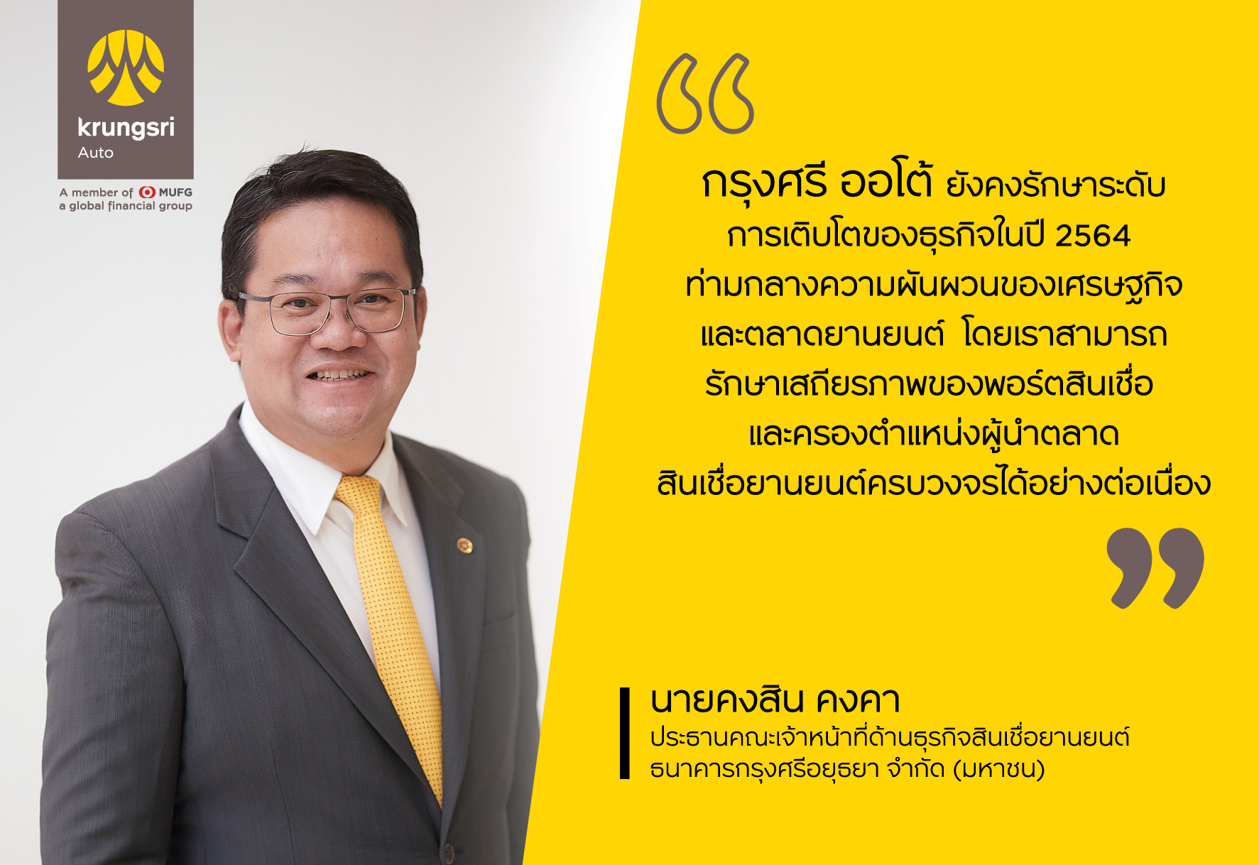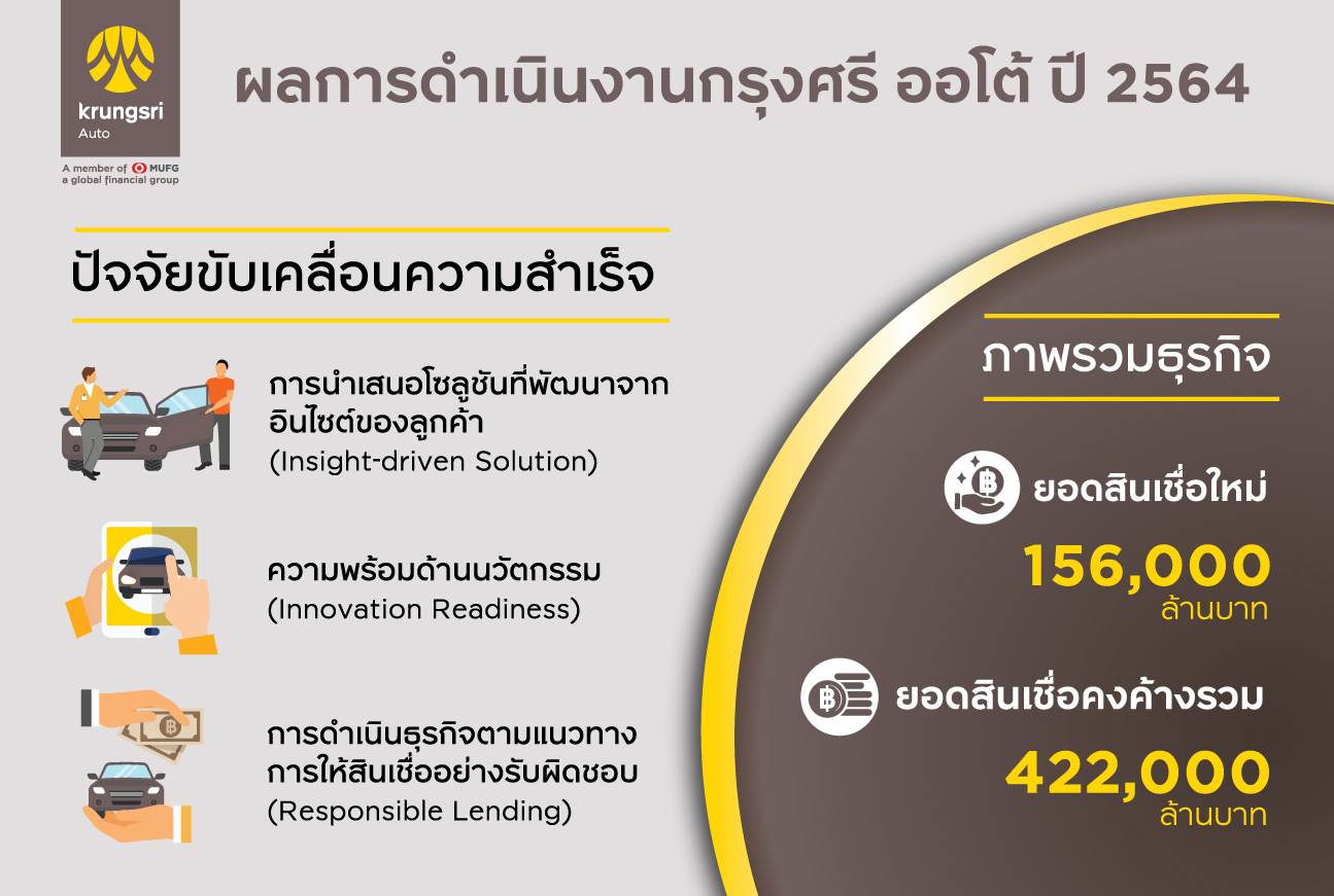 15 กุมภาพันธ์ 2565 : นายคงสิน คงคา ประธานคณะเจ้าหน้าที่ด้านธุรกิจสินเชื่อยานยนต์ ธนาคารกรุงศรีอยุธยา จำกัด (มหาชน) กล่าวว่า “ปี 2564 ยังคงเป็นช่วงเวลาที่เต็มไปด้วยความไม่แน่นอนจากการแพร่ระบาดของโควิด-19 ซึ่งส่งผลให้สภาวะเศรษฐกิจและตลาดยานยนต์ในทุกเซ็กเมนต์มีความผันผวนสูง โดยยอดขายรถยนต์ใหม่หดตัวลง 4% ในขณะที่ตลาดสินเชื่อยานยนต์โดยรวมปรับตัวลดลง 2.5% อย่างไรก็ดี กรุงศรี ออโต้ ยังคงรักษาระดับการเติบโตของธุรกิจ ด้วยมูลค่ายอดสินเชื่อใหม่ 156,000 ล้านบาท และยอดสินเชื่อคงค้างรวม 422,000 ล้านบาท”