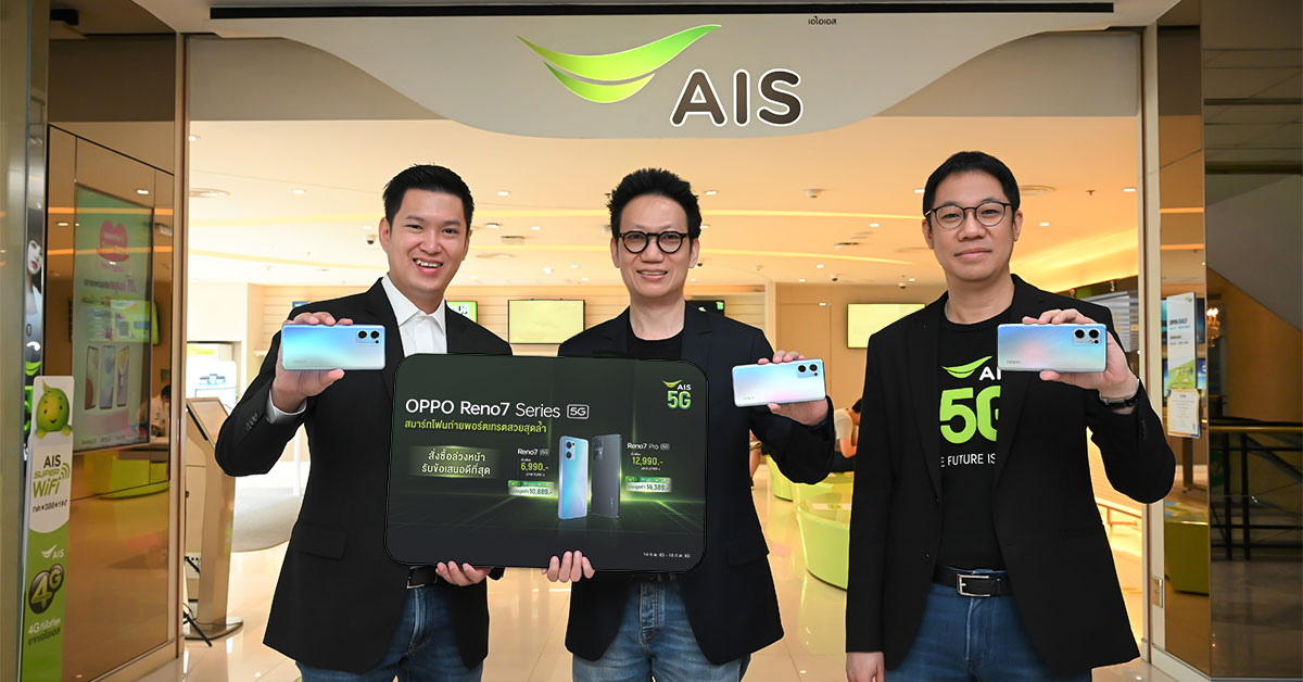 15 กุมภาพันธ์ 2565 : OPPO ผนึกกำลังกับ เอไอเอส นำโดย คุณทวีเกียรติ ธัญญวัฒนกุล หัวหน้าแผนกงานบริหารธุรกิจอุปกรณ์สื่อสาร (คนที่ 2 จากซ้าย) และ คุณทิฐินันท์ โชตินันทน์ หัวหน้าแผนกงานการตลาดด้านผลิตภัณฑ์ บริษัท แอดวานซ์ อินโฟร์ เซอร์วิส จำกัด (มหาชน) หรือ AIS (คนที่ 1 จากขวา) จับมือผนึกกำลังกับพันธมิตร คุณชานนท์ จิรายุกุล ประธานกรรมการอาวุโสฝ่ายบริหาร ออปโป้แห่งประเทศไทย (คนที่ 1 จากซ้าย) เปิดจอง OPPO Reno7 Series 5G สมาร์ทโฟน 5G ที่ถ่ายวิดีโอพอร์ตเทรตได้ดีที่สุด ในราคาสุดคุ้มเริ่มต้นเพียง 6,990 บาท พร้อมข้อเสนอสุดพิเศษมากมาย เมื่อจองผ่านเอไอเอส ตั้งแต่วันนี้ – 18 กุมภาพันธ์นี้