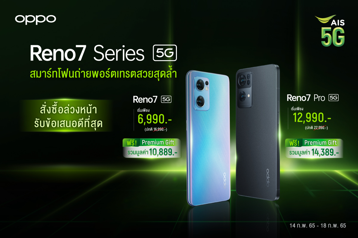 เป็นเจ้าของ OPPO Reno7 Series 5G ในราคาที่คุ้มค่ามากกว่าเดิม กับโปรโมชั่นสุด Exclusive เมื่อจองผ่านเอไอเอส ที่เอไอเอสช็อปและร้านเทเลวิซทุกสาขา ตั้งแต่วันนี้ – 18 กุมภาพันธ์นี้ ดังนี้