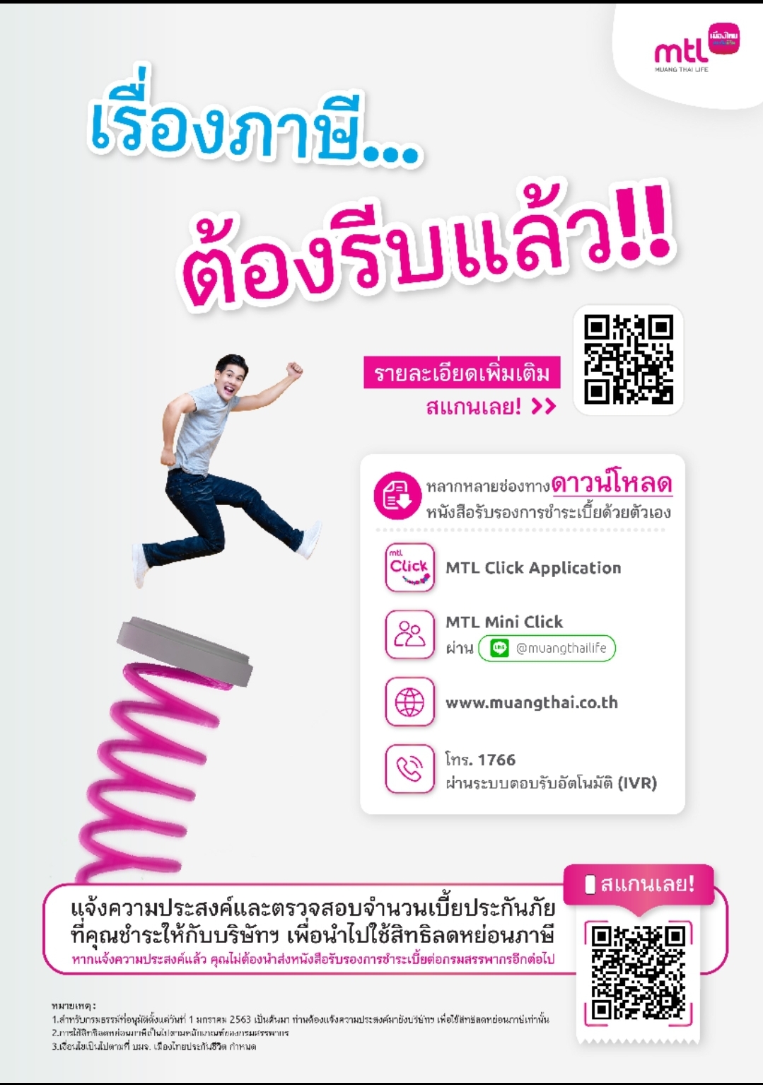 สำหรับลูกค้าที่แจ้งความประสงค์เรียบร้อยแล้ว บริษัทฯ จะนำส่งข้อมูลการชำระเบี้ยประกันภัย รูปแบบอิเล็กทรอนิกส์ให้กับกรมสรรพากร และบริษัทฯ ขอยกเลิกการจัดส่งหนังสือรับรองการชำระเบี้ยประกันภัยรูปแบบกระดาษตั้งแต่ปีภาษี 2564 เป็นต้นไป โดยสามารถแจ้งความประสงค์ได้ที่เว็บไซต์เมืองไทยประกันชีวิต หรือ MTL Mini Click (ผ่าน Line @muangthailife) ในขณะเดียวกันหากลูกค้าต้องการตรวจสอบจำนวนเบี้ยประกันภัยที่สามารถใช้สิทธิในการลดหย่อนภาษี หรือต้องการดาวน์โหลดหนังสือรับรองการชำระเบี้ยประกันภัยก็สามารถทำรายการได้ด้วยตนเองผ่านหลากหลายช่องทาง อาทิ