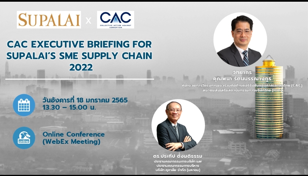 17 กุมภาพันธ์ 2565 : บริษัท ศุภาลัย จำกัด (มหาชน) มุ่งเน้นในการยกระดับคู่ค้าประเภทวิสาหกิจขนาดกลางและขนาดย่อม (SME) ในการเป็นแนวร่วมต่อต้านคอร์รัปชันของภาคเอกชนไทย หรือ CAC สมาคมส่งเสริมสถาบันกรรมการบริษัทไทย (IOD) จึงจัดงานสัมมนา “CAC EXECUTIVE BRIEFING FOR SUPALAI’S SME SUPPLY CHAIN 2022” ผ่านระบบออนไลน์