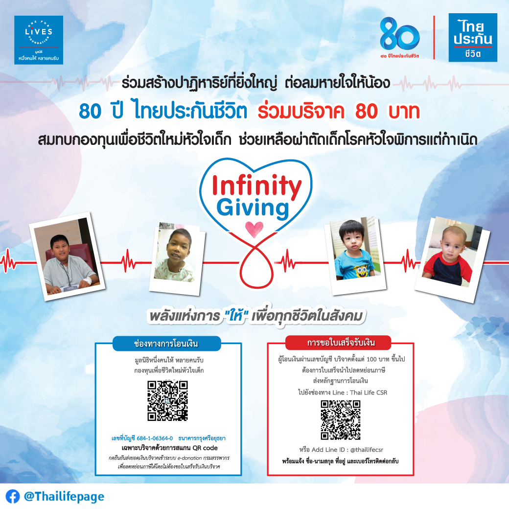 นอกจากนั้นบริษัทฯ ยังได้ร่วมกับมูลนิธิหนึ่งคนให้ หลายคนรับ จัดกิจกรรม “80 ปี ไทยประกันชีวิต ร่วมบริจาค 80 บาท” เชิญชวนประชาชนร่วมบริจาคเงินเพื่อเป็นค่าใช้จ่ายในการผ่าตัดเด็กโรคหัวใจพิการแต่กำเนิดที่ขาดแคลนทุนทรัพย์ โดยสามารถบริจาคได้ที่บัญชี "มูลนิธิหนึ่งคนให้ หลายคนรับ (กองทุนเพื่อชีวิตใหม่หัวใจเด็ก)" ธนาคารกรุงศรีอยุธยา สาขาอาคารไทยประกันชีวิต เลขที่บัญชี 684-1-063640 บริจาคเงินตั้งแต่ 100 บาท ขึ้นไป สามารถขอรับใบเสร็จเพื่อลดหย่อนภาษีได้ โดยส่งหลักฐานการโอนเงินไปยัง Line ID : @thailifecsr พร้อมแจ้ง ชื่อ ที่อยู่ และเบอร์โทรศัพท์ หรือสอบถามรายละเอียดเพิ่มเติม โทร.1124