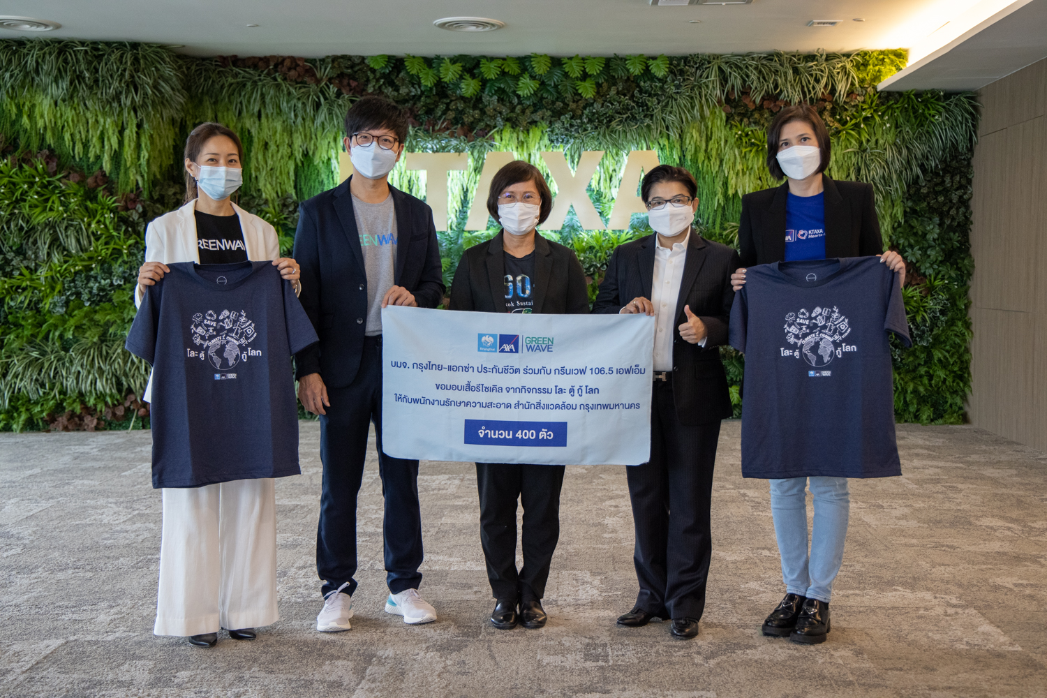 22 กุมภาพันธ์ 2565 : บมจ.กรุงไทย-แอกซ่า ประกันชีวิต นำโดย คุณบุปผาวดี โอวรารินท์ ประธานเจ้าหน้าที่บริหาร ฝ่ายทรัพยากรบุคคลและภาพลักษณ์องค์กรและสื่อสารองค์กร (คนที่ 2 จากขวา) ร่วมกับกรีนเวฟ 106.5 เอฟเอ็ม มอบเสื้อรีไซเคิลจากกิจกรรม “โละตู้กู้โลก” จำนวน 400 ตัว ให้กับพนักงานรักษาความสะอาด สำนักสิ่งแวดล้อมกรุงเทพมหานคร โดยคุณสุธิศา พรเพิ่มพูน ผู้อำนวยการสำนักงานจัดการ ขยะมูลฟอยและสิ่งปฎิกูล สำนักสิ่งแวดล้อม (คนที่ 3 จากขวา) เป็นตัวแทนรับมอบ