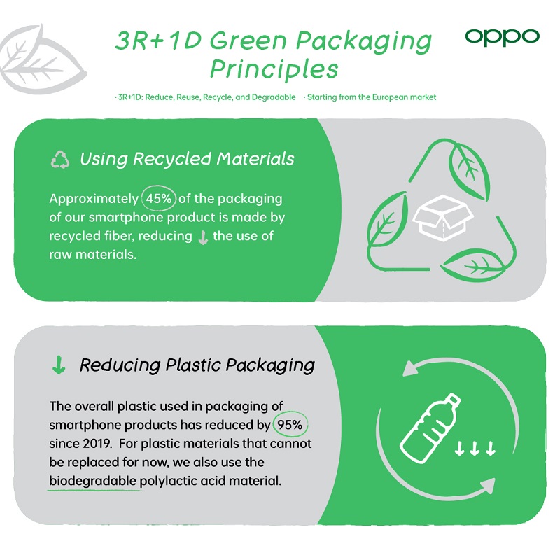 OPPO มุ่งมั่นที่จะนำหลักการบรรจุภัณฑ์เพื่อความยั่งยืน “3R+1D” ซึ่งเป็นที่ยอมรับในระดับสากลมาใช้ในการลดน้ำหนักของบรรจุภัณฑ์ การนำวัสดุรีไซเคิลมาใช้ใหม่ และการใช้วัสดุที่สามารถรีไซเคิลและย่อยสลายได้ตามธรรมชาติในบรรจุภัณฑ์ เริ่มจากตลาดในยุโรปในปี 2564
