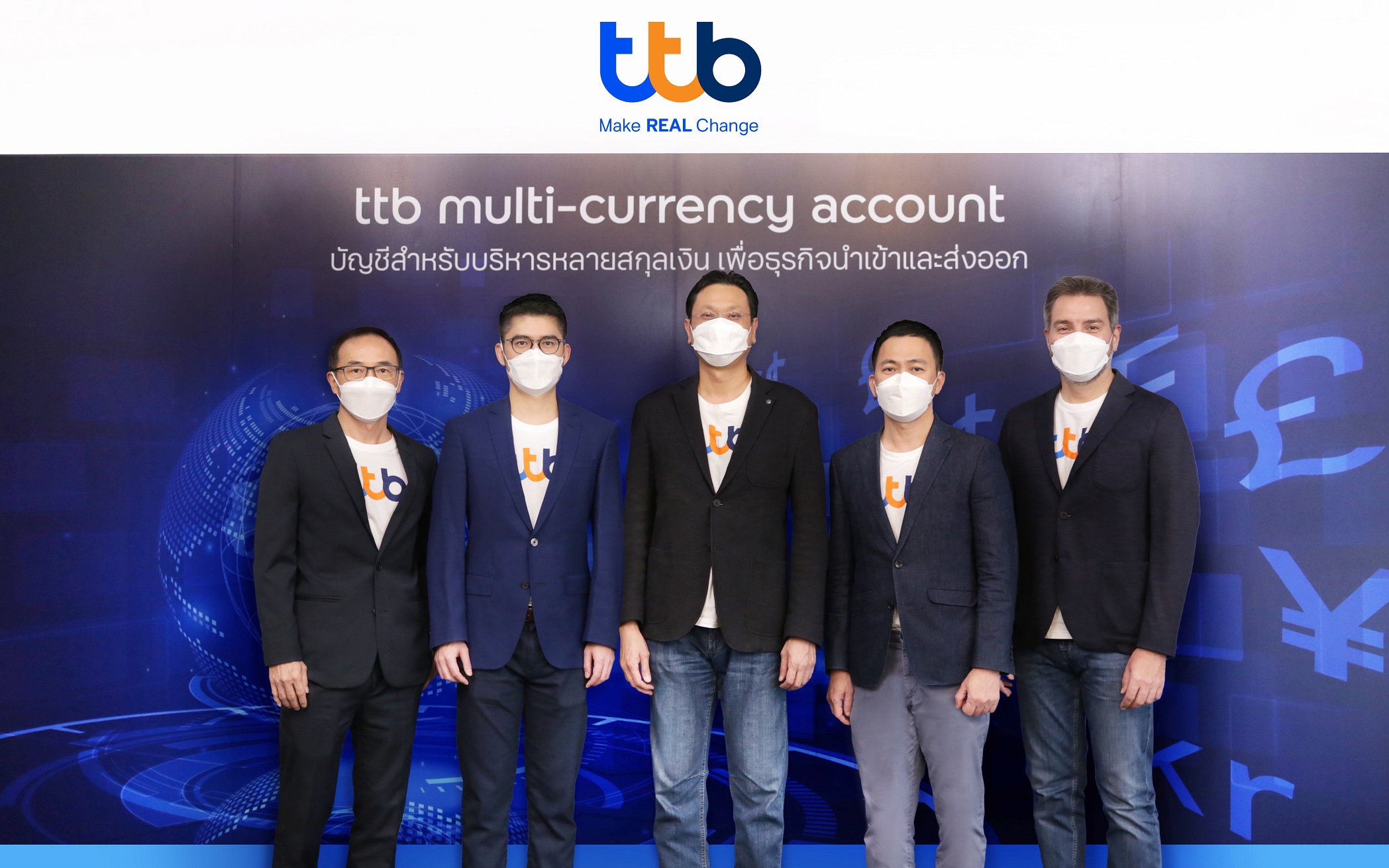 กรุงเทพฯ 24 กุมภาพันธ์ 2565 : ทีเอ็มบีธนชาต หรือ ทีทีบี (ttb) โดย นายเสนธิป ศรีไพพรรณ (ที่ 3 จากซ้าย) ประธานเจ้าหน้าที่บริหารลูกค้าธุรกิจ ร่วมเปิดตัว “ttb multi-currency account” บัญชีสำหรับบริหารหลายสกุลเงินที่ดีที่สุด ตอบโจทย์ลูกค้าธุรกิจกลุ่มนำเข้าและส่งออก ที่รองรับได้มากถึง 11 สกุลเงินหลักในบัญชีเดียว พร้อมยกระดับประสบการณ์การใช้งานดิจิทัลครบทุกขั้นตอนอย่างเต็มรูปแบบ ผ่านอินเทอร์เน็ตแบงก์กิ้ง ใช้งานง่าย ครบ จบในระบบเดียว และยังสามารถใช้ระบบเดียวกันทำธุรกรรม ซื้อ