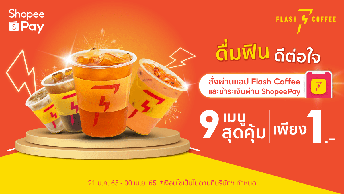 ชวนดื่มเครื่องดื่มสุดฟินจาก Flash Coffee แบบสบายกระเป๋าในราคาสุดคุ้มเพียง 1 บาทเมื่อจ่ายผ่าน ShopeePay วันนี้ – 30 เมษายน 2565[2]