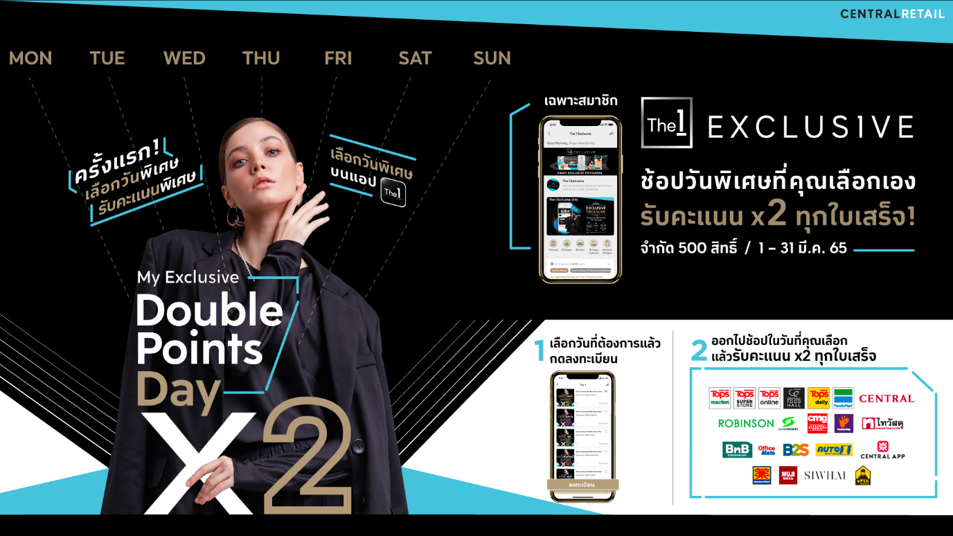 1 มีนาคม 2565 : The 1 ผู้นำดิจิทัลไลฟ์สไตล์และลอยัลตี้แพลตฟอร์มอันดับ 1 ของไทย ภายใต้กลุ่มเซ็นทรัล เปิดตัวแคมเปญใหม่ล่าสุด “My Exclusive Double Points Day” ผนึกกำลังเครือเซ็นทรัล รีเทล ต่อยอดกลยุทธ์ Personalized Experience เพื่อตอบโจทย์ความต้องการของสมาชิกได้อย่างตรงจุดตรงใจอย่างแท้จริง รับสิทธิ์สะดวกเพียงปลายนิ้ว เพียงสมาชิก The 1 Exclusive ดาวน์โหลดแอปพลิเคชั่น The 1 และเข้าไปที่หน้า The 1 Exclusive เลือกรีวอร์ด My Exclusive Double Points Day หรือคลิก https://www.the1.co.th/rewards/2a8e45a2-b85d-4b58-8f58-788ae7437bad