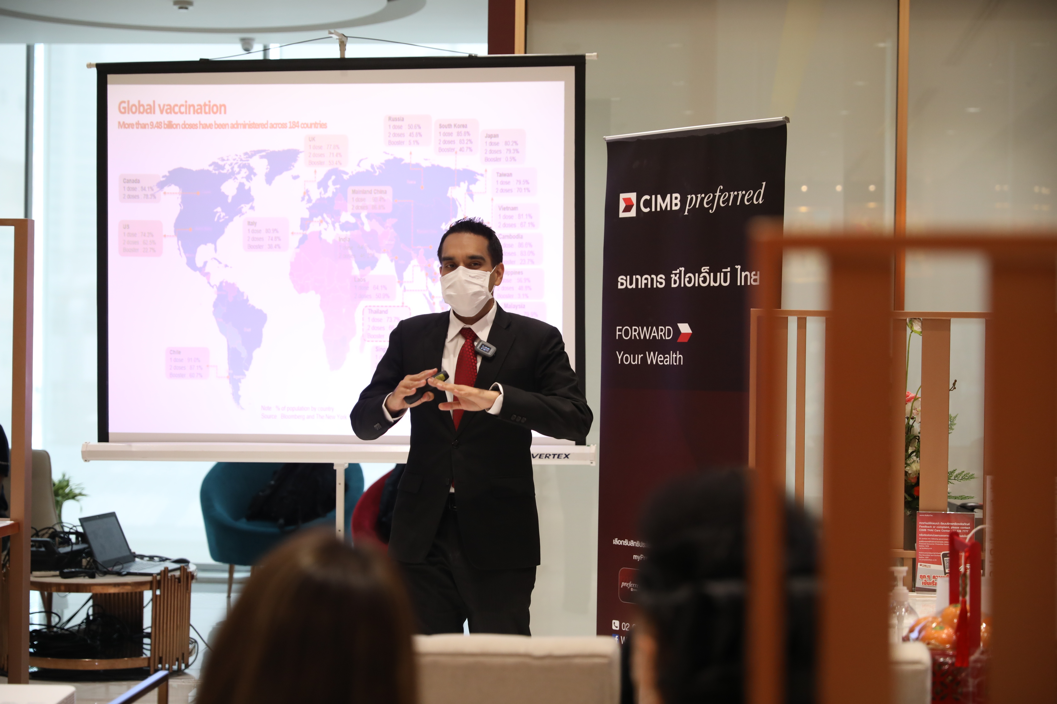 3 มีนาคม 2565 : สุวดิส ดิสถาพร ผู้ช่วยกรรมการผู้จัดการใหญ่ ผู้บริหารช่องทางการขาย ธุรกิจรายย่อย ดร.อมรเทพ จาวะลา ผู้ช่วยกรรมการผู้จัดการใหญ่ ผู้บริหารสำนักวิจัย และที่ปรึกษาการลงทุน นางสาวศรีนวล จารุศิริวัฒนา ผู้บริหารเครือข่ายสาขา ธุรกิจรายย่อย และนายกษาปณ์ อมาตยกุล ผู้อำนวยการภาค กรุงเทพ 1 ธนาคาร ซีไอเอ็มบี ไทย จำกัด (มหาชน) ร่วมงานสัมมา Investment Outlook Amidst Covid-19 New Wave เพื่ออัพเดทมุมมองทางเศรษฐกิจและการลงทุนภายใต้ภาวะเศรษฐกิจปัจจุบันที่ยังคงต้องเผชิญกับโควิด-19 ระลอกใหม่แก่ลูกค้าCIMB Preferred