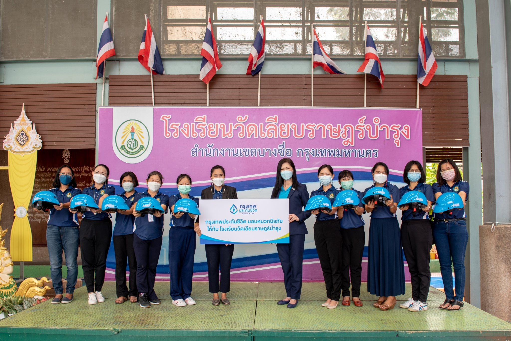 3 มีนาคม 2565 : กรุงเทพประกันชีวิต นำโดย อรนุช สำราญฤทธิ์ (ที่ 6 จากขวา) ผู้ช่วยผู้จัดการใหญ่ สายประกันชีวิต และ ขวัญชนก แดงนวน (ที่ 6 จากซ้าย) ผู้อำนวยการสถานศึกษาโรงเรียนวัดเลียบราษฎร์บำรุง เป็นตัวแทนมอบหมวกนิรภัย ให้แก่คณะครู นักเรียน เยาวชนและชุมชนโดยรอบ โรงเรียนวัดเลียบราษฎร์บำรุง สำนักงานเขตบางซื่อ เพื่อช่วยลดความเสี่ยงและส่งเสริมความปลอดภัยในชีวิตประจำวัน อีกทั้งกิจกรรมดังกล่าวยังเป็นส่วนหนึ่งของโครงการรณรงค์ความปลอดภัยทางถนน ![]()