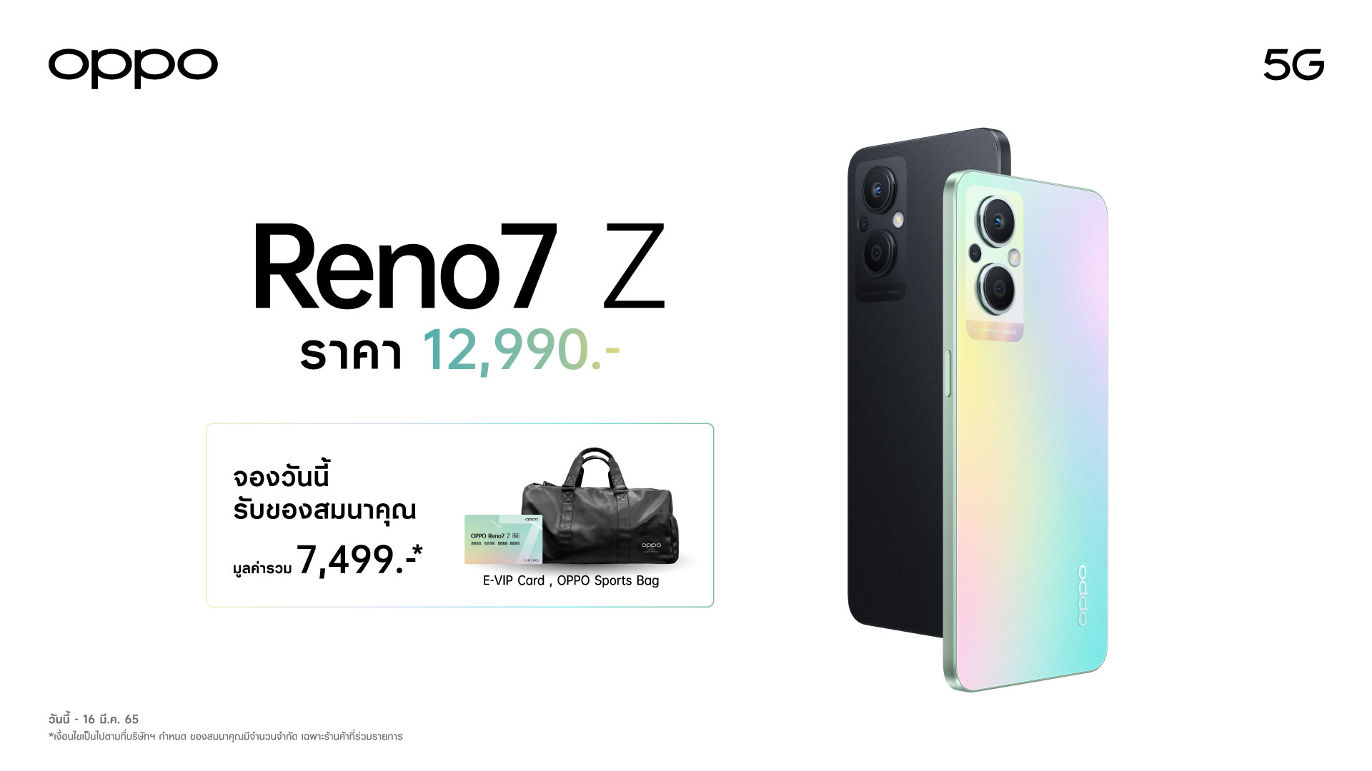 สมาร์ทโฟน 5G ที่ถ่ายภาพพอร์ตเทรตที่ดีที่สุด OPPO Reno7 Z 5G รุ่นล่าสุด กับนวัตกรรมถ่ายภาพที่ให้เป็นตัวเองได้ไม่จำกัดด้วยพอร์ตเทรต เตรียมวางจำหน่ายในราคา 12,990 บาท มี 2 สี ได้แก่ สีรุ้ง Rainbow Spectrum และสีดำ Cosmic Black จองได้แล้วตั้งแต่วันนี้ - 16 มีนาคมนี้ พร้อมรับของสมนาคุณ E-VIP Card ประกันหน้าจอแตก และ OPPO SPORTS BAG มูลค่ารวม 7,499 บาท
