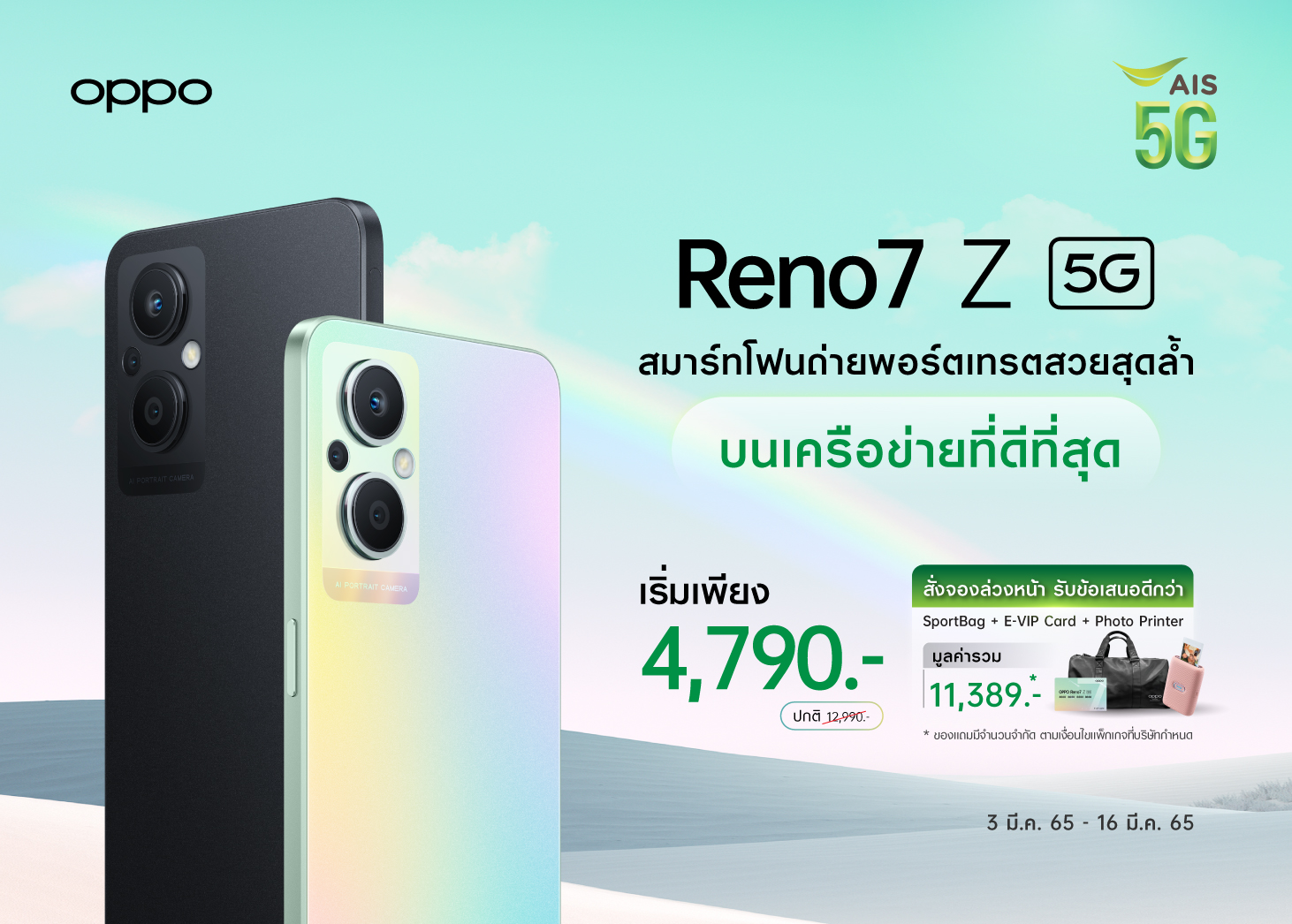เป็นเจ้าของ OPPO Reno7 Z 5G ในราคาที่คุ้มค่ามากกว่าเดิม กับโปรโมชั่นสุด Exclusive เมื่อจองผ่านเอไอเอส ที่เอไอเอสช็อปและร้านเทเลวิซทุกสาขา ตั้งแต่วันนี้– 16 มีนาคมดังนี้