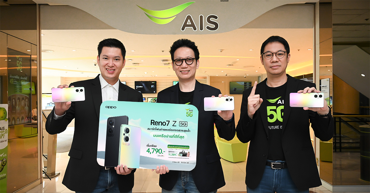 4 มีนาคม 2565 : OPPO ผนึกกำลังกับ เอไอเอส นำโดย คุณทวีเกียรติ ธัญญวัฒนกุล หัวหน้าแผนกงานบริหารธุรกิจอุปกรณ์สื่อสาร (คนที่ 2 จากซ้าย) และ คุณทิฐินันท์ โชตินันทน์ หัวหน้าแผนกงานการตลาดด้านผลิตภัณฑ์ บริษัท แอดวานซ์ อินโฟร์ เซอร์วิส จำกัด (มหาชน) หรือ AIS (คนที่ 1 จากขวา) จับมือผนึกกำลังกับพันธมิตร คุณชานนท์ จิรายุกุล ประธานกรรมการอาวุโสฝ่ายบริหาร ออปโป้แห่งประเทศไทย (คนที่ 1 จากซ้าย) เปิดจอง OPPO Reno7 Z 5G สมาร์ทโฟน 5G ที่ถ่ายภาพพอร์ตเทรตได้ดีที่สุด ในราคาสุดคุ้มเริ่มต้นเพียง 4,790 บาท พร้อมข้อเสนอสุดพิเศษมากมาย เมื่อจองผ่านเอไอเอส ตั้งแต่วันนี้ – 16 มีนาคมนี้