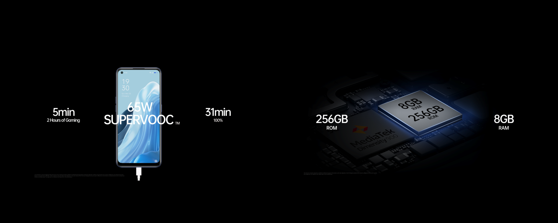 สำหรับ OPPO Reno7 5G รองรับการสื่อสารแห่งอนาคต 5G และ Wi-Fi 6 เพื่อมอบการเชื่อมต่อที่รวดเร็วมากยิ่งขึ้นด้วยขุมพลัง MediaTek Dimensity 900 5G SoC พร้อมกับ RAM ขนาดใหญ่ 8GB และ ROM 256GB อีกทั้งยังมาพร้อมเทคโนโลยี RAM Expansion เพิ่ม RAM ได้สูงสุด 5GB