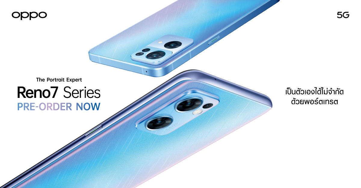 OPPO Reno7 Series 5G สมาร์ทโฟน 5G ที่ถ่ายวิดีโอพอร์ตเทรตได้ดีที่สุด ตอกย้ำความเป็น The Portrait Expert ตัวจริง วางจำหน่าย 2 รุ่น ได้แก่ OPPO Reno7 5G ราคา 16,990 บาท มีให้เลือก 2 สี ได้แก่ สีฟ้า Startrails Blue และสีดำ Starry Black