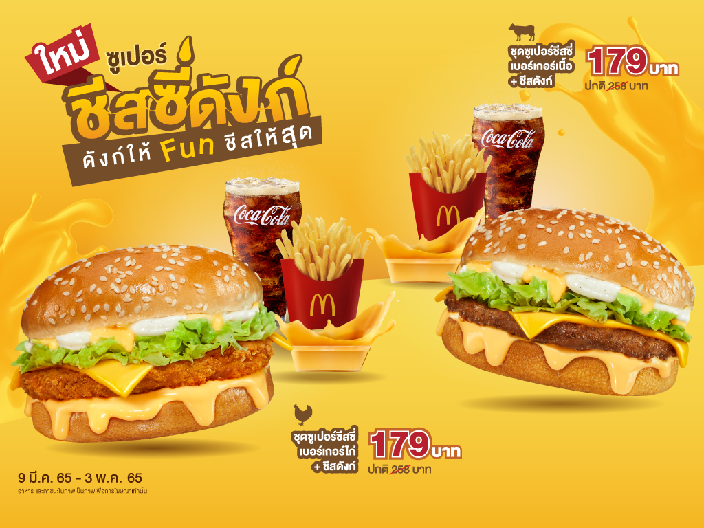 9 มีนาคม 2565 : แมคโดนัลด์ เอาใจเหล่าชีสเลิฟเวอร์กับสุดยอดเมนูชีสที่ทุกคนรอคอยกับเบอร์เกอร์ “ซูเปอร์ชีสซี่ดังก์” (Super Cheesy Dunk) จัดหนักชีสแบบจุใจด้วยเชดด้าชีสสเปรดล้น ๆ ถึงสองชั้น บวกความฟินอีกขั้นกับชีสเต็มแผ่นจากนิวซีแลนด์ และเพิ่ม option ความ Fun ให้สุดกับโมเมนต์ที่จับเบอร์เกอร์แล้วดังก์ชีสในถ้วยใหญ่สะใจ คนรักชีสไม่ควรพลาดด้วยประการทั้งปวง ลองเลยตั้งแต่วันนี้ ถึง 3 พฤษภาคมนี้ที่แมคโดนัลด์