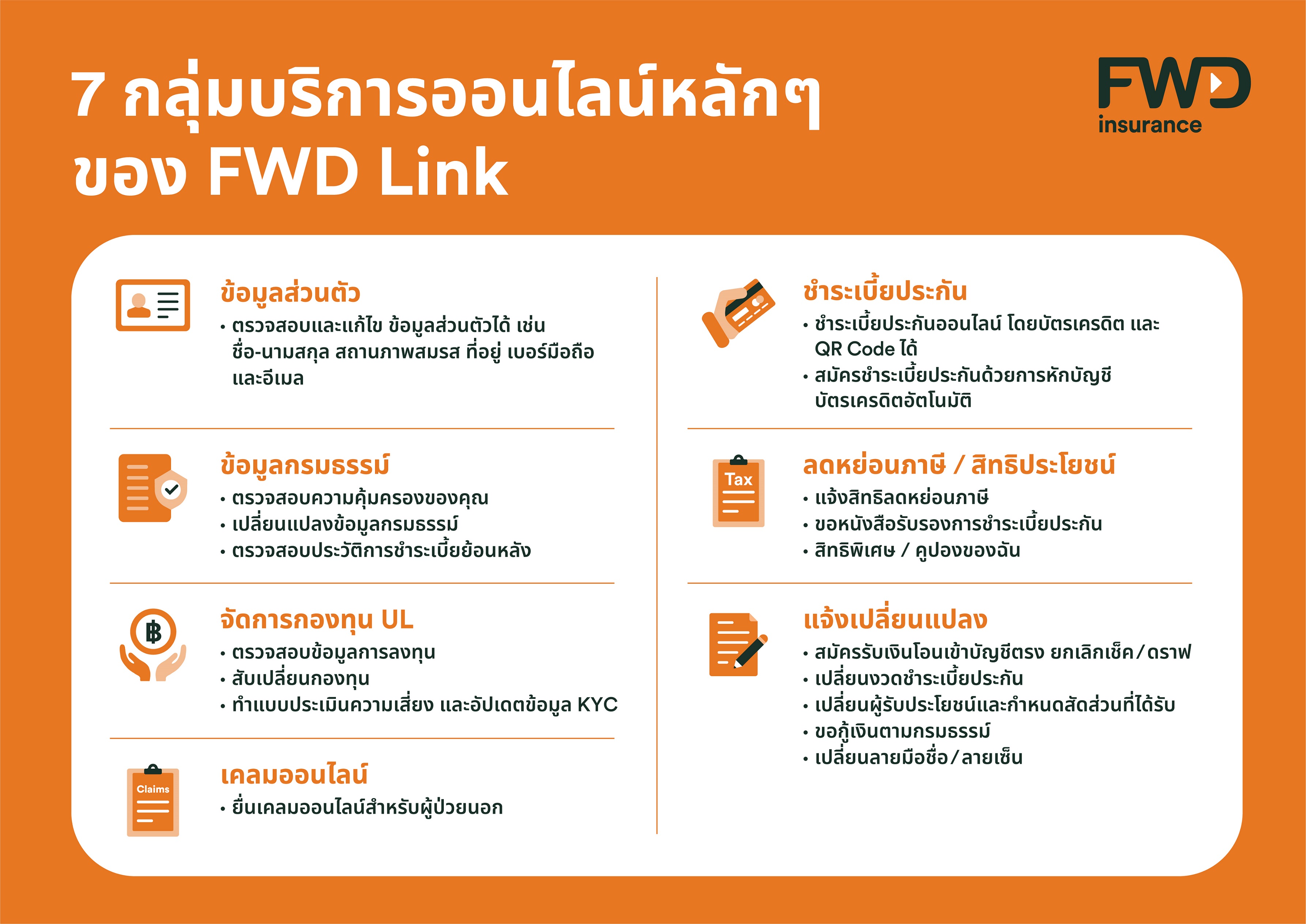 บริการออนไลน์ FWD Link รวมบริการเด่นครอบคลุมการใช้งานหลัก 7 หมวด ประกอบด้วย 1. บริการตรวจสอบและแก้ไขข้อมูลส่วนตัว ชื่อ นามสกุล ที่อยู่ อีเมล และหมายเลขโทรศัพท์ 2. บริการตรวจสอบและเปลี่ยนแปลงข้อมูลกรมธรรม์ ตรวจสอบข้อมูลความคุ้มครอง ประวัติการชำระเบี้ยย้อนหลัง 3. บริการเปลี่ยนวิธีรับเงินคืนตามผลประโยชน์กรมธรรม์เข้าบัญชีธนาคารโดยตรง ยกเลิกเช็ค/ดราฟ เปลี่ยนงวดชำระเบี้ย เปลี่ยนผู้รับประโยชน์ และขอกู้เงินตามกรมธรรม์