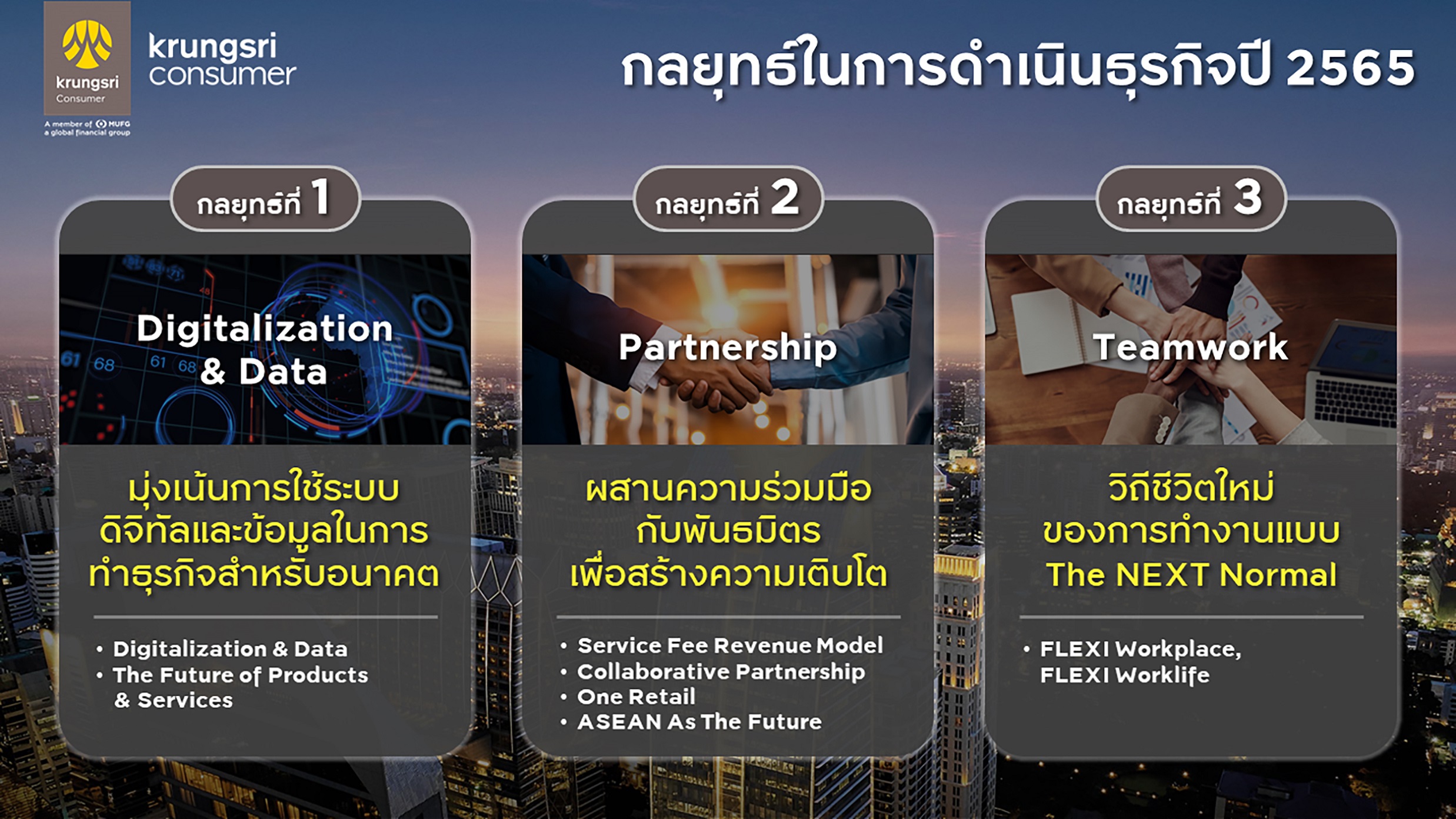 1. การใช้ระบบดิจิทัลและข้อมูลในการทำธุรกิจสำหรับอนาคต โดยมุ่งเน้นการสร้างระบบนิเวศน์ดิจิทัล ผ่านการขยายแพลตฟอร์มข้อมูล และพัฒนาผลิตภัณฑ์ทางการเงินและบริการใหม่ๆ ผ่านช่องทางดิจิทัล ทั้งการพัฒนาบัตรเครดิตดิจิทัลใหม่ๆ ที่มีจุดเด่นหลากหลาย ตอบโจทย์ไลฟ์สไตล์ที่แตกต่าง ซึ่งจะทยอยเปิดตัวภายในปีนี้ รวมถึงบริการใหม่ ๆ เช่น การปล่อยสินเชื่อส่วนบุคคลดิจิทัล โดยกรุงศรี คอนซูมเมอร์ ได้ใบอนุญาตให้ประกอบธุรกิจจากธนาคารแห่งประเทศไทย และคาดว่าจะเริ่มให้บริการในครึ่งปีหลังของปี 2565, พร้อมอำนวยความสะดวกให้ลูกค้ายิ่งขึ้น