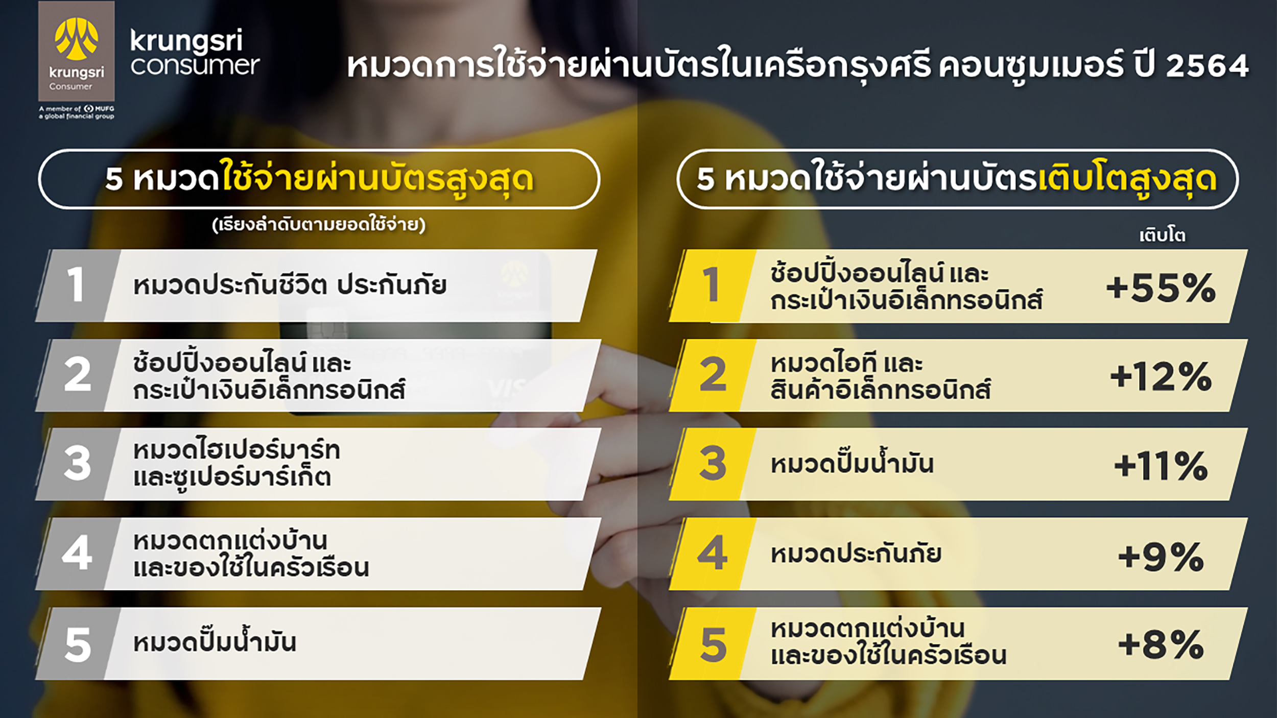 “ทั้งนี้ หมวดใช้จ่ายผ่านบัตรสูงสุดเรียงตามยอดใช้จ่าย ได้แก่ 1.ประกันภัย, 2.ช้อปปิ้งออนไลน์และกระเป๋าเงินอิเล็กทรอนิกส์, 3.ไฮเปอร์มาร์ทและซูเปอร์มาร์เก็ต, 4. ตกแต่งบ้านและเครื่องใช้ในครัวเรือน, 5. ปั๊มน้ำมัน ส่วนหมวดใช้จ่ายที่มีอัตราเติบโตมากที่สุด 5 อันดับแรก ได้แก่ 1. ช้อปปิ้งออนไลน์และกระเป๋าเงินอิเล็กทรอนิกส์ (+55%), 2.ไอทีและสินค้าอิเล็กทรอนิกส์ (+12%), 3.ปั๊มน้ำมัน (+11%), 4. ประกันภัย (+9%), และ 5. ตกแต่งบ้านและของใช้ในครัวเรือน (+8%) ข้อมูลดังกล่าวชี้ให้เห็นว่า ยอดการช้อปปิ้งผ่านออนไลน์แพลตฟอร์มยังคงเติบโตแบบก้าวกระโดด