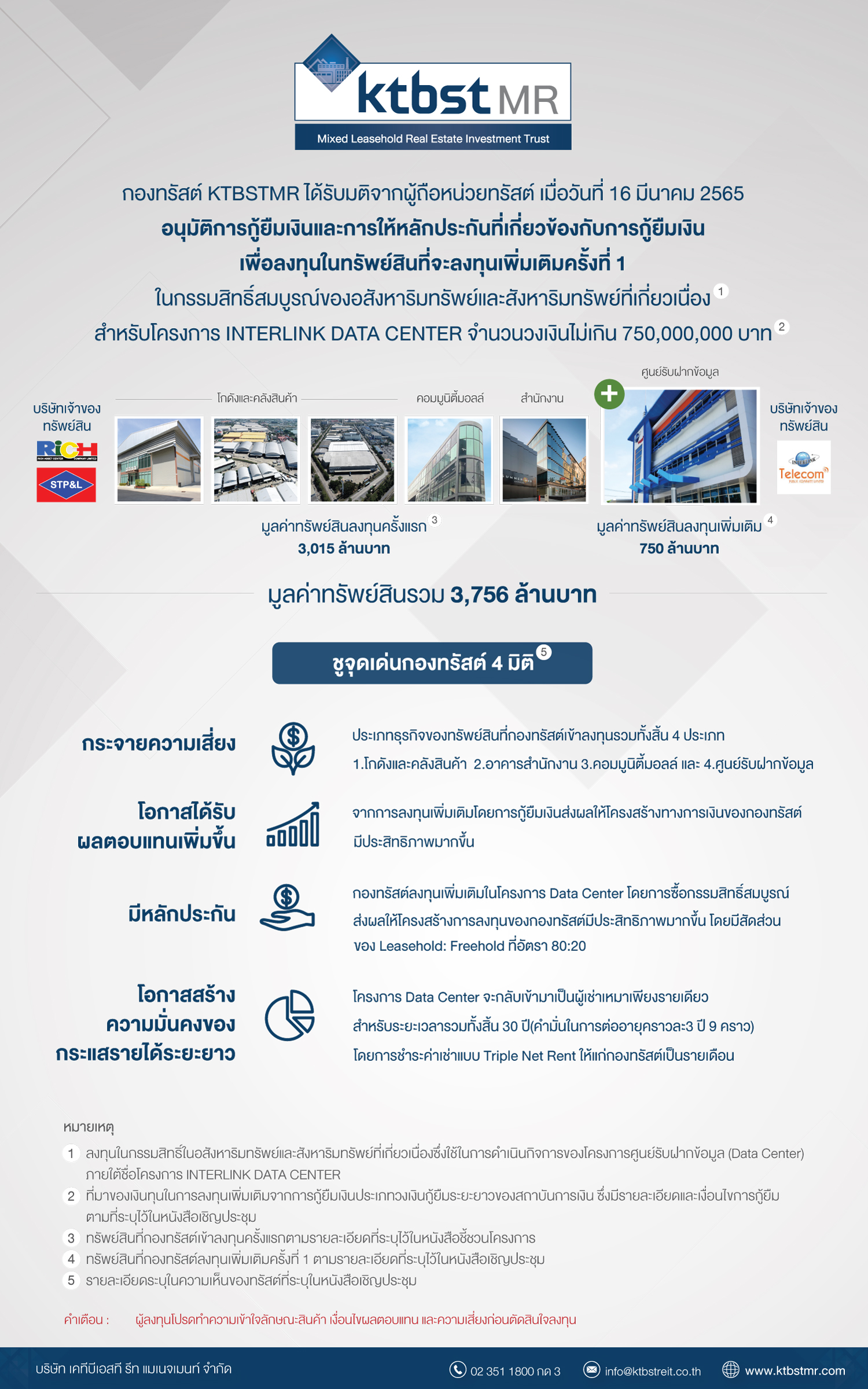 22 มีนาคม 2565 : นายพลสิทธิ ภูมิวสนะ ประธานเจ้าหน้าที่บริหาร บริษัท เคทีบีเอสที รีท แมเนจเมนท์ จำกัด หรือ ‘KTBST REIT’ ในฐานะผู้ก่อตั้งทรัสต์และผู้จัดการกองทรัสต์ เปิดเผยว่า เพื่อเป็นการสร้างการเติบโตจากการลงทุนสังหาริมทรัพย์คุณภาพสูงในระยะยาว กองทรัสต์ KTBSTMR ได้รับมติจากผู้ถือหน่วยทรัสต์ เมื่อวันที่ 16 มี.ค. 2565 อนุมัติการกู้ยืมเงินและการให้หลักประกันที่เกี่ยวข้องกับการกู้ยืมเงินเพื่อลงทุนใน โครงการศูนย์รับฝากข้อมูล INTERLINK DATA CENTER จำนวนวงเงินไม่เกิน 750 ล้านบาท ด้วยการซื้อกรรมสิทธิ์สมบูรณ์