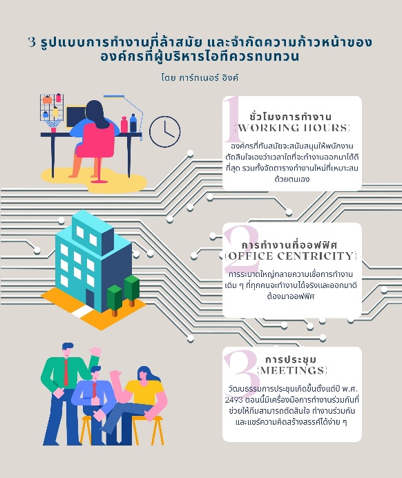 การทำงานที่ออฟฟิศ (Office centricity) — การระบาดใหญ่ได้ทลายความเชื่อการทำงานเดิม ๆ ที่ทุกคนจะทำงานได้จริงและออกมาดีต้องมาออฟฟิศ และมีหัวหน้างานคอยสอดส่องดูแลช่วยเหลือควบคุมความคืบหน้าของงาน ปัจจุบันองค์กรธุรกิจส่วนใหญ่กำลังวางแผนปรับโหมดการทำงานไปสู่ไฮบริดเพื่อรองรับการทำงานในอนาคต และเข้าใจว่าพนักงานสามารถทำงานได้อย่างเต็มประสิทธิภาพจากระยะไกล สำหรับงานที่ต้องใช้ 'สมาธิ' ขณะที่ออฟฟิศยังเป็นสถานที่ที่เหมาะที่สุดสำหรับทำกิจกรรมร่วมกันบางอย่าง อาทิ สำหรับสร้างความสัมพันธ์และทำงานร่วมกัน
