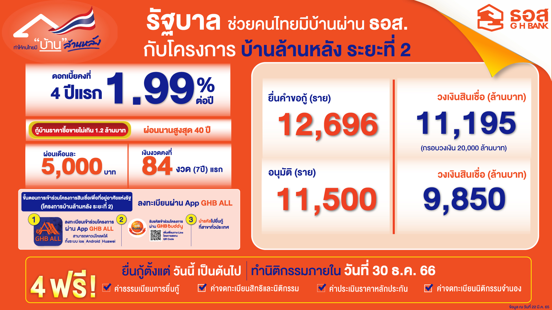 ทั้งนี้ ประชาชนที่สนใจยังสามารถลงทะเบียนผ่าน Mobile Application : GHB ALL เพื่อเข้าร่วมโครงการได้อย่างต่อเนื่อง เพราะโครงการบ้านล้านหลัง ระยะที่ 2 จะสิ้นสุดยื่นคำขอกู้และทำนิติกรรมในวันที่ 30 ธันวาคม 2566 หรือ เมื่อมีลูกค้าได้รับอนุมัติสินเชื่อและทำนิติกรรมเต็มกรอบวงเงิน 20,000 ล้านบาท