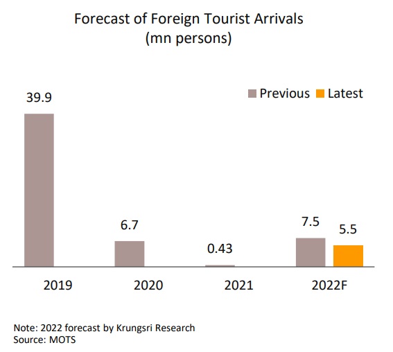 ii) การสู้รบระหว่างรัสเชีย-ยูเครนที่มีแนวโน้มยืดเยื้อถึงไตรมาส 2 ซึ่งนอกจากจะส่งผลทางตรงต่อนักท่องเที่ยวรัสเซียที่เดินทางมาไทยในช่วงที่เหลือของปีแล้ว ทิศทางการฟื้นตัวของเศรษฐกิจโลกมีแนวโน้มชะลอลง ส่งผลกระทบเชิงลบต่อรายได้ ขณะที่วิกฤตราคาพลังงานส่งผลต่อต้นทุนการเดินทางขยับขึ้นทำให้นักท่องเที่ยวอาจชะลอการเดินทางออกไป ล่าสุดวิจัยกรุงศรีปรับลดคาดการณ์จำนวนนักท่องเที่ยวต่างชาติในปีนี้อยู่ที่ 5.5 ล้านคน จากเดิมคาด 7.5 ล้านคน ![]()
