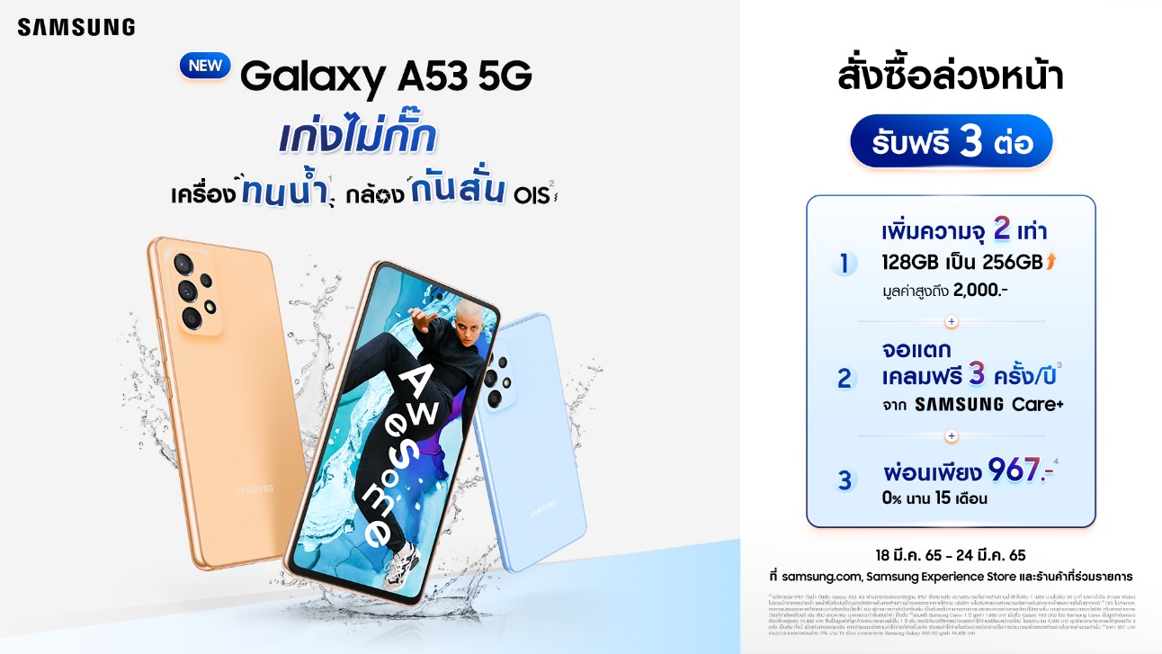 พร้อมรับโปรโมชั่นสุดคุ้ม 3 ต่อ ได้แก่ สิทธิ์เพิ่มความจุ 2 เท่า จาก 128 กิกะไบต์ เป็น 256 กิกะไบต์ มูลค่าสูงถึง 2,000 บาท พร้อมการรับประกันนาน 1 ปีจาก Samsung Care+ ที่สามารถเคลมจอแตกฟรี 3 ครั้งต่อปี มูลค่า 1,899 บาท รวมถึงยังสามารถผ่อนชำระ 0% นานถึง 15 เดือน ในราคาเพียง 994 บาทต่อเดือนเท่านั้น ผู้ที่สนใจสามารถติดตามรายละเอียดเพิ่มเติมได้ที่ https://www.samsung.com/th/smartphones/galaxy-a53-5g-pre-order/ ![]()