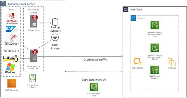 จากภาพประกอบในกรณีของ On-premise ตัว NetBackup ทำการ backup แล้วจะส่งข้อมูลที่ถูก Backup และ Deduplicate ส่งไปเก็บบน AWS S3, Glacier, หรือ Deep Archive ทำให้สามารถลดพื้นที่ในการใช้งานบน AWS Storage รวมถึงใช้ลดปริมาณการใช้งาน Network อีกด้วย