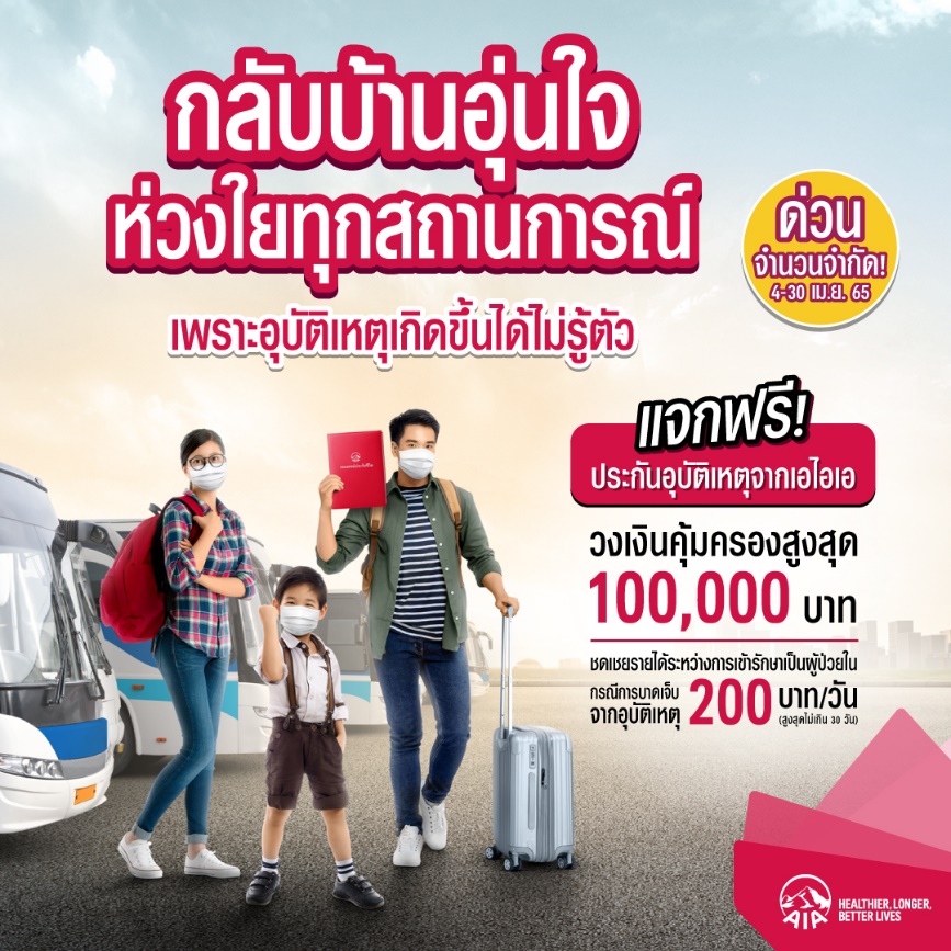 กรุงเทพฯ, 4 เมษายน 2565 : เอไอเอ ประเทศไทย จัดแคมเปญ แจกฟรี “กรมธรรม์ประกันภัยสงกรานต์อุ่นใจ (ไมโครอินชัวรันส์)” เพื่อสนับสนุนให้คนไทยมีสุขภาพและชีวิตที่ดีขึ้น สอดคล้องตามคำมั่นสัญญา ‘Healthier, Longer, Better Lives’ มอบกรมธรรม์อุบัติเหตุฟรีให้แก่ประชาชนทั่วไป วงเงินคุ้มครองชีวิตสูงสุดถึง 100,000 บาทต่อกรมธรรม์ กรณีเสียชีวิตจากอุบัติเหตุ พร้อมผลประโยชน์ค่าชดเชยรายได้ระหว่างการเข้ารักษาตัวเป็นผู้ป่วยใน กรณีได้รับบาดเจ็บจากอุบัติเหตุ 200 บาทต่อวัน (สูงสุดไม่เกิน 30 วัน) ระยะเวลาคุ้มครองนาน 30 วัน นับตั้งแต่วันและเวลาที่ลงทะเบียนและรับสิทธิ จำนวน 100,000 สิทธิ ตลอดทั้งแคมเปญ