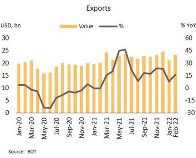5 เมษายน 2565 : วิจัยกรุงศรี ชี้เศรษฐกิจเดือนกุมภาพันธ์ได้แรงหนุนจากภาคส่งออกที่เติบโตดี ขณะที่การใช้จ่ายในประเทศชะลอลงเล็กน้อย โดยมูลค่าการส่งออกกลับมาเติบโตในอัตราเลขสองหลัก (+16% YoY) ตามอุปสงค์ต่างประเทศที่ปรับดีขึ้น ด้านจำนวนนักท่องเที่ยวต่างชาติเพิ่มขึ้นจากเดือนมกราคม จากการกลับมาเปิดลงทะเบียนเข้าประเทศผ่านระบบ Test & Go ตั้งแต่ต้นเดือนกุมภาพันธ์