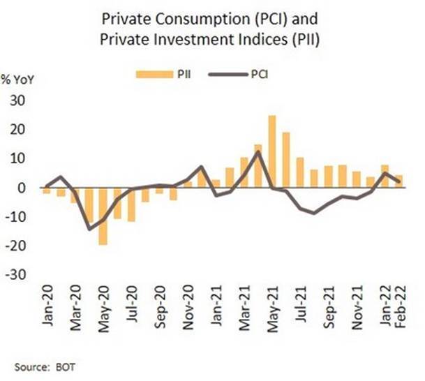 ส่วนการใช้จ่ายในประเทศ ดัชนีการบริโภคภาคเอกชนเติบโตชะลอลง (+2.3% จาก 5.0%) เป็นผลจากสถานการณ์การระบาดในประเทศที่กลับมารุนแรงขึ้น ประกอบกับราคาพลังงานและราคาอาหารปรับตัวสูงขึ้น บั่นทอนความเชื่อมั่นของผู้บริโภคปรับลดลง อย่างไรก็ดี มาตรการภาครัฐยังเป็นปัจจัยบวกที่ช่วยพยุงการใช้จ่ายภาคครัวเรือน เช่นเดียวกับการลงทุนภาคเอกชนขยายตัวชะลอลง (+4.3% จาก 7.8%) ตามการลดลงของการนำเข้าสินค้าทุนเป็นหลัก ขณะที่การลงทุนภาคก่อสร้างค่อนข้างทรงตัว