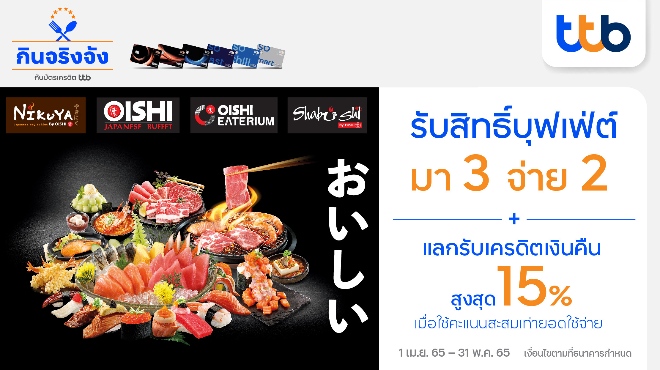 5 เมษายน 2565 : บัตรเครดิต ทีทีบี จับมือ โออิชิ กรุ๊ป มอบสิทธิพิเศษ บุฟเฟต์อิ่มคุ้มไม่อั้น มา 3 จ่าย 2 เมื่อใช้จ่ายผ่านบัตรเครดิต ทีทีบี กับ 4 ร้านอาหารญี่ปุ่นในเครือโออิชิ ได้แก่ โออิชิ อีทเทอเรียม, โออิชิ บุฟเฟ่ต์, นิกุยะ และ ชาบูชิ ตั้งแต่วันนี้ ถึง 31 พฤษภาคม 2565 โดยลูกค้าสามารถกดรับสิทธิ์ USSD ตามประเภทร้านอาหาร และราคา ตามด้วยหมายเลขบัตรเครดิต 12 หลักแรก ตามด้วย # แล้วกดโทรออกเพื่อรับข้อความตอบกลับทาง SMS จำกัดส่วนลด 1 สิทธิ์ / หมายเลขบัตรเครดิต / โต๊ะ / ใบเสร็จ (จำกัด 3,500 สิทธิ์ ตลอดรายการส่งเสริมการขาย รวมสิทธิ์ทุกร้านอาหารที่ร่วมรายการ)