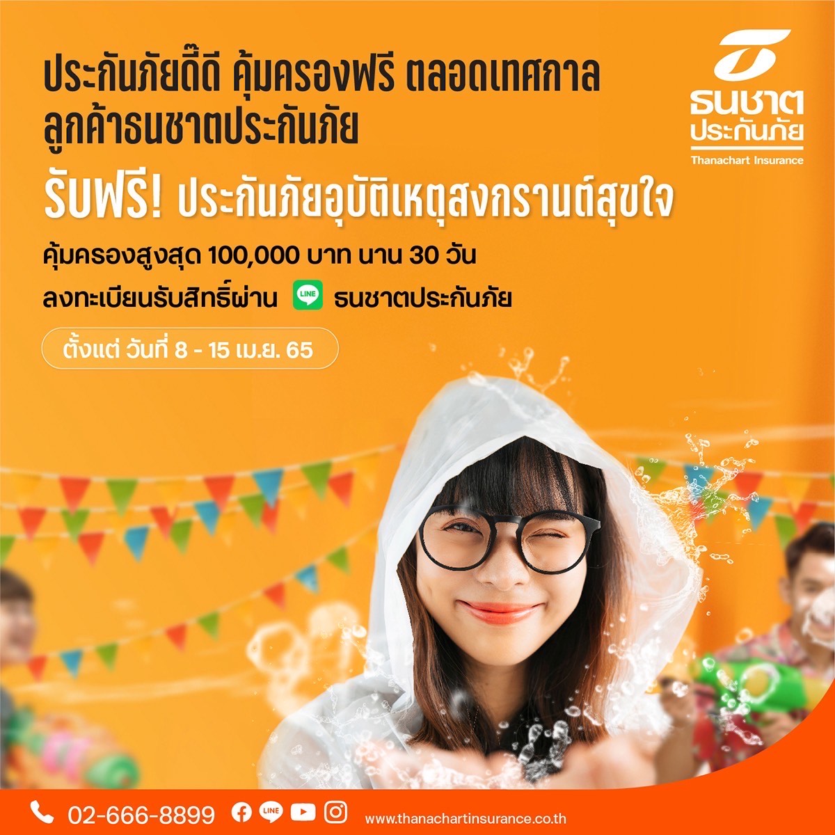 7 เมษายน 2565 : นายพีระพัฒน์ เมฆสิงห์วี ประธานเจ้าหน้าที่บริหาร บริษัท ธนชาตประกันภัย จำกัด (มหาชน) เปิดเผยว่า ในช่วงเทศกาลสงกรานต์และวันครอบครัวปีนี้ เพื่อให้ลูกค้าเดินทางกลับบ้านและท่องเที่ยวได้อย่างมีความสุข ขอมอบกรมธรรม์ประกันภัยอุบัติเหตุสงกรานต์สุขใจ ที่ให้ความคุ้มครองอุบัติเหตุวงเงินสูงสุด 100,000 บาท เพียงลงทะเบียนรับสิทธิผ่าน Line Official Account “ธนชาตประกันภัย” ตั้งแต่วันที่ 8 – 15 เมษายน 2565 โดยจะได้รับความคุ้มครองในวันถัดไปหลังมีข้อความยืนยันจากบริษัท และกรมธรรม์นี้มีระยะเวลาความคุ้มครองนานถึง 30 วัน