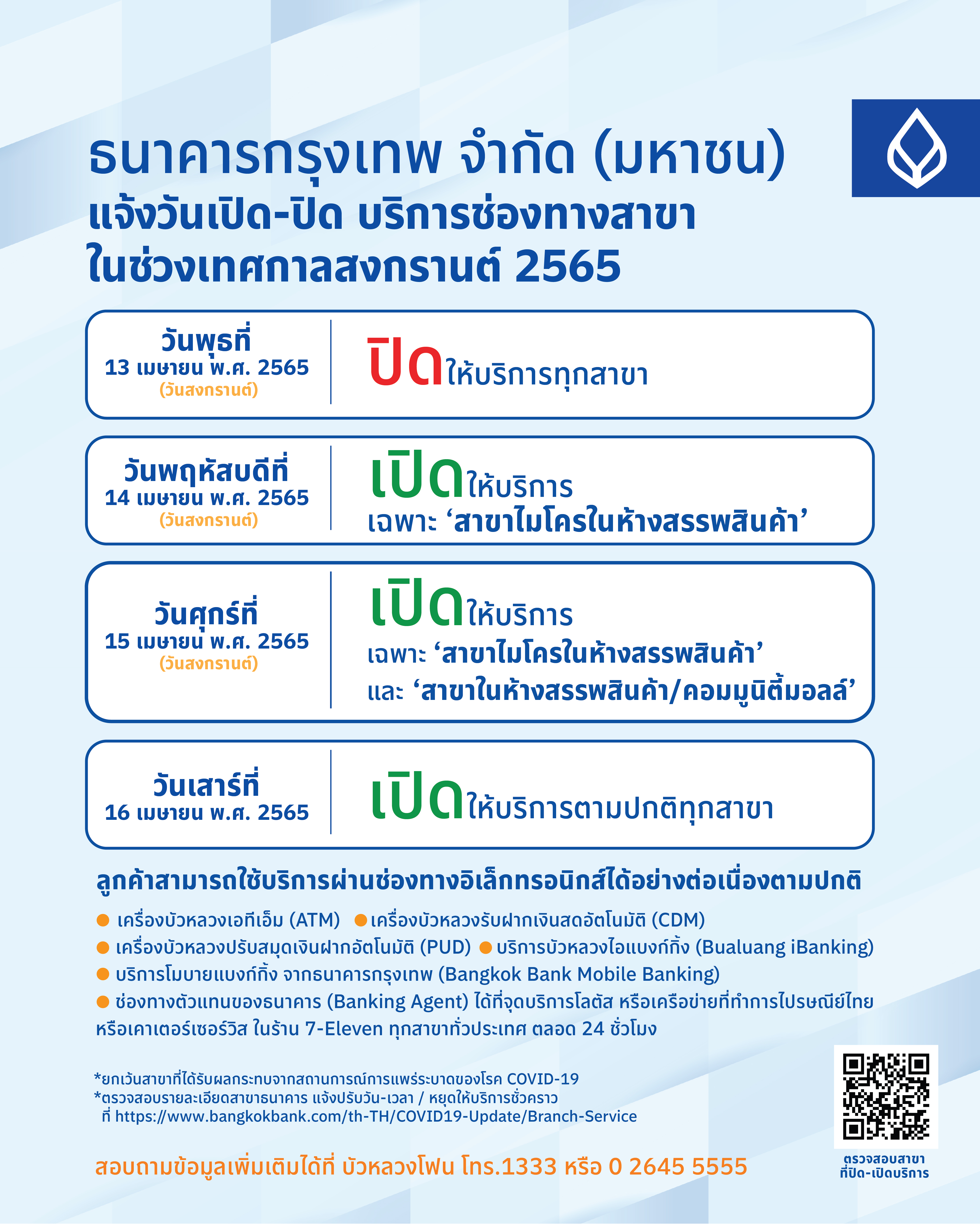 สำหรับช่วงวันหยุดดังกล่าวลูกค้าสามารถใช้บริการทางการเงินของธนาคารกรุงเทพได้ที่ ‘สาขาไมโครในห้างสรรพสินค้า’ กว่า 200 แห่งทั่วประเทศ ยกเว้นในวันพุธที่ 13 เมษายน พ.ศ.2565 ที่จะปิดให้บริการเพียง 1 วัน และยกเว้นสาขาที่ได้รับผลกระทบจากสถานการณ์แพร่ระบาดของโรค COVID-19 รวมถึงยังสามารถใช้บริการผ่านช่องทางตัวแทนของธนาคาร (Banking Agent) ได้ที่จุดบริการโลตัส หรือเครือข่ายที่ทำการไปรษณีย์ไทย หรือเคาเตอร์เซอร์วิส ในร้าน 7-Eleven ทุกสาขาทั่วประเทศ ตลอด 24 ชั่วโมง รวมกว่า 15,000 จุด ซึ่งยังเปิดให้บริการเป็นปกติ ภายใต้มาตรฐานด้านสุขอนามัยเพื่อร่วมป้องกันและควบคุมการแพร่ระบาดโรคCOVID-19 ของกระทรวงสาธารณสุขอย่างเคร่งครัด