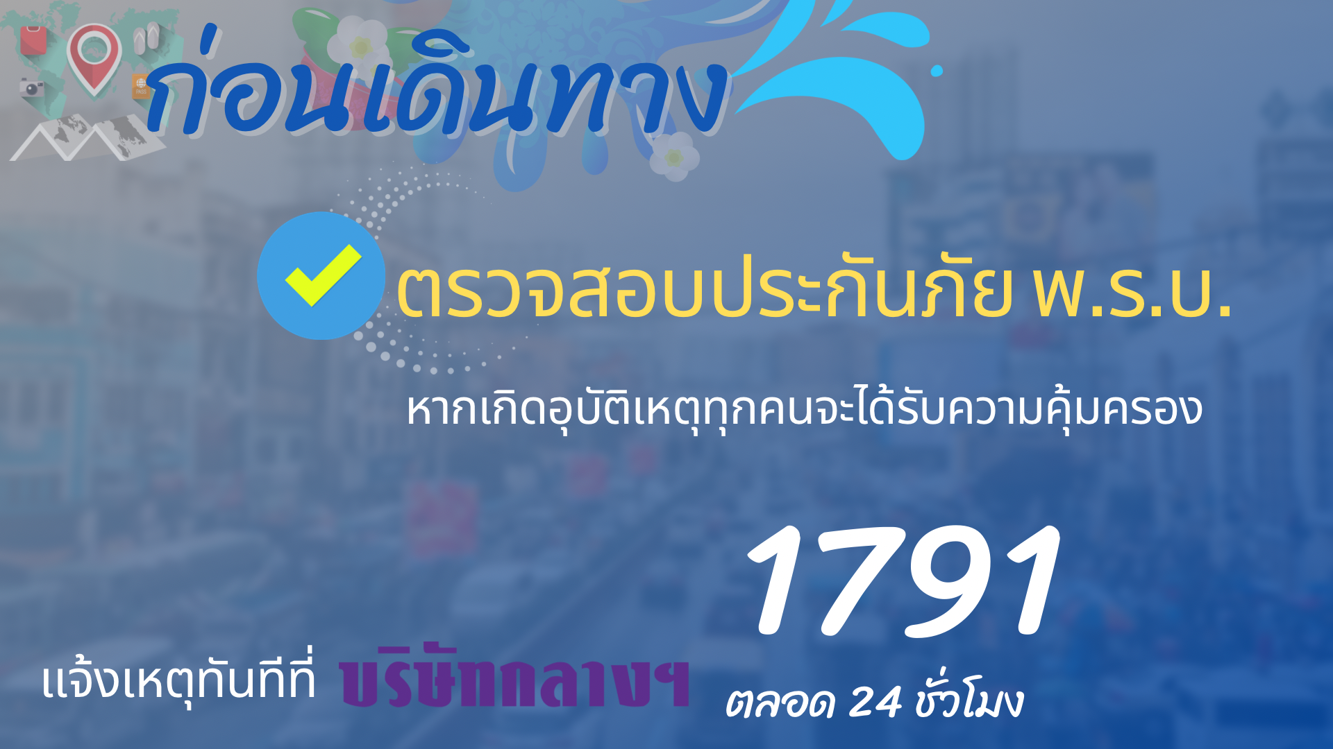 8 เมษายน 2565 : ในช่วงเทศกาลสงกรานต์ปีนี้ มีวันหยุดยาวต่อเนื่องหลายวัน การเดินทางไปและกลับในช่วงเทศกาลนอกจากประชาชนผู้ใช้รถใช้ถนนต้องวางแผนการเดินทางให้ดีแล้ว การเตรียมความพร้อมของตัวรถด้วยการตรวจสภาพรถก่อนการเดินทาง ผู้ขับขี่ต้องมีใบอนุญาตขับขี่ และต้องอย่าลืมตรวจสอบการมีประกันภัย พ.ร.บ.ของรถ ด้วยเช่นกัน เพื่อเป็นหลักประกันให้ผู้ประสบภัยจากรถทุกคนว่าเมื่อเกิดอุบัติเหตุขึ้น จะได้รับการคุ้มครองตามกฎหมาย ซึ่งในหลายเทศกาลที่ผ่านมา มีผู้ประสบภัยจากรถจำนวนมากที่ไม่ได้รับความคุ้มครองตามกฎหมาย เพราะเจ้าของรถไม่ทำประกันภัย พ.ร.บ.