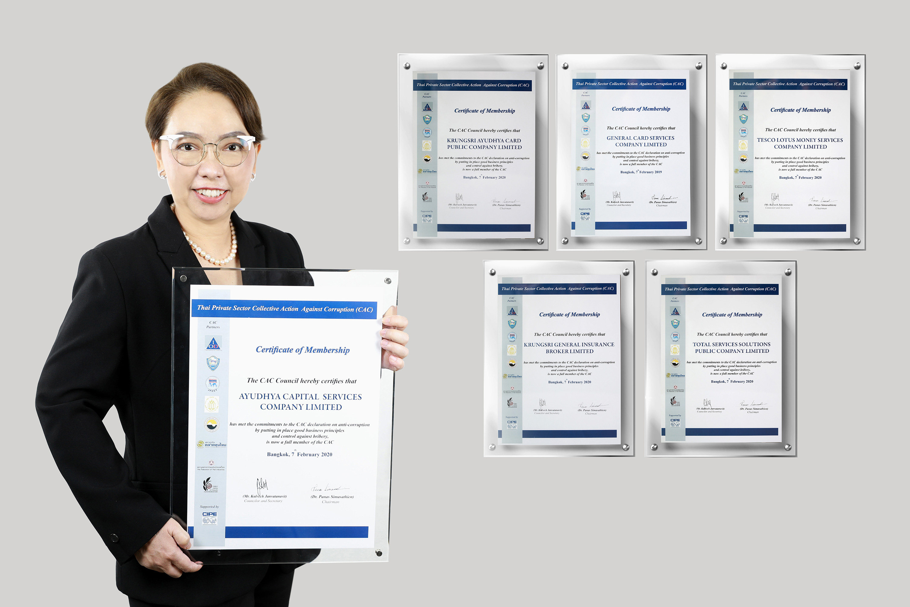 กรุงเทพฯ, 11 เมษายน 2565 : นางสาวณญาณี เผือกขำ ประธานกรรมการ กรุงศรี คอนซูมเมอร์ ผู้ให้บริการบัตรเครดิต สินเชื่อส่วนบุคคล สินเชื่อผ่อนชำระ และโบรกเกอร์ประกันชีวิตและประกันวินาศภัย เป็นตัวแทนกลุ่มบริษัทในเครือ ได้แก่ บริษัท อยุธยา แคปปิตอล เซอร์วิสเซส จำกัด, บริษัท บัตรกรุงศรีอยุธยา จำกัด,บริษัท เจเนอรัล คาร์ด เซอร์วิสเซส จำกัด, บริษัท โลตัสส์ มันนี่ เซอร์วิสเซส จำกัด, บริษัท กรุงศรี เจเนอรัล อินชัวรันส์ โบรคเกอร์ จำกัด และบริษัท โทเทิล เซอร์วิสเซส โซลูชั่นส์ จำกัด (มหาชน) รับมอบประกาศนียบัตรผ่านการรับรองการเป็นสมาชิกแนวร่วมต่อต้านคอร์รัปชันของภาคเอกชนไทย (Thai Private Sector Collective Action Against Corruption) ต่อเนื่องเป็นครั้งที่ 3