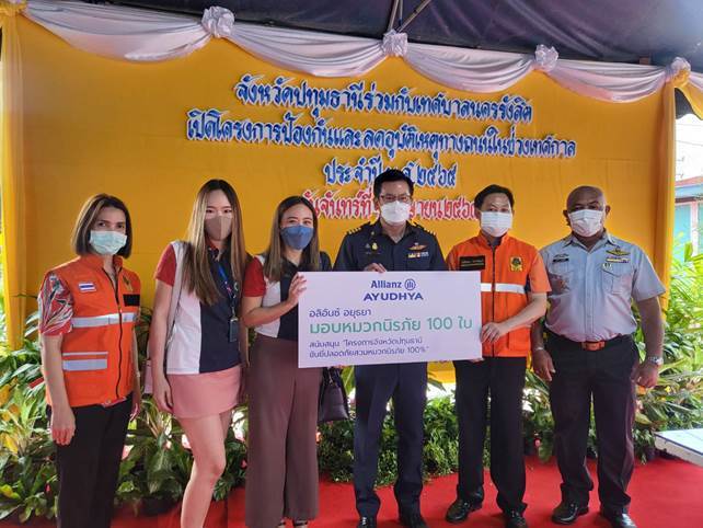 12 เมษายน 2565 : ภาริสา ฉายากุล (ที่สามจากซ้าย) ผู้อำนวยการฝ่ายบริหารภาพลักษณ์องค์กรและสื่อสารองค์กร บมจ.อลิอันซ์ อยุธยา ประกันชีวิต เป็นตัวแทนบริษัทฯ มอบหมวกนิรภัย 100 ใบ ในโครงการเปิดศูนย์ปฏิบัติการป้องกันและลดอุบัติเหตุทางถนน ช่วงเทศกาลสงกรานต์ เพื่อรณรงค์การขับขี่อย่างปลอดภัยและลดอุบัติเหตุในช่วงเทศกาลสงกรานต์ โดยมี พีระยศ เหมะสิขัณฑกะ (ที่สามจากขวา) ผู้อำนวยการสำนักงานคณะกรรมการกำกับและส่งเสริมการประกอบธุรกิจประกันภัยจังหวัดปทุมธานี เป็นผู้รับมอบ ณ ท่าจอดรถขาออกต่างจังหวัด อ.ธัญบุรี จ.ปทุมธานี เมื่อเร็วๆ นี้ ![]()