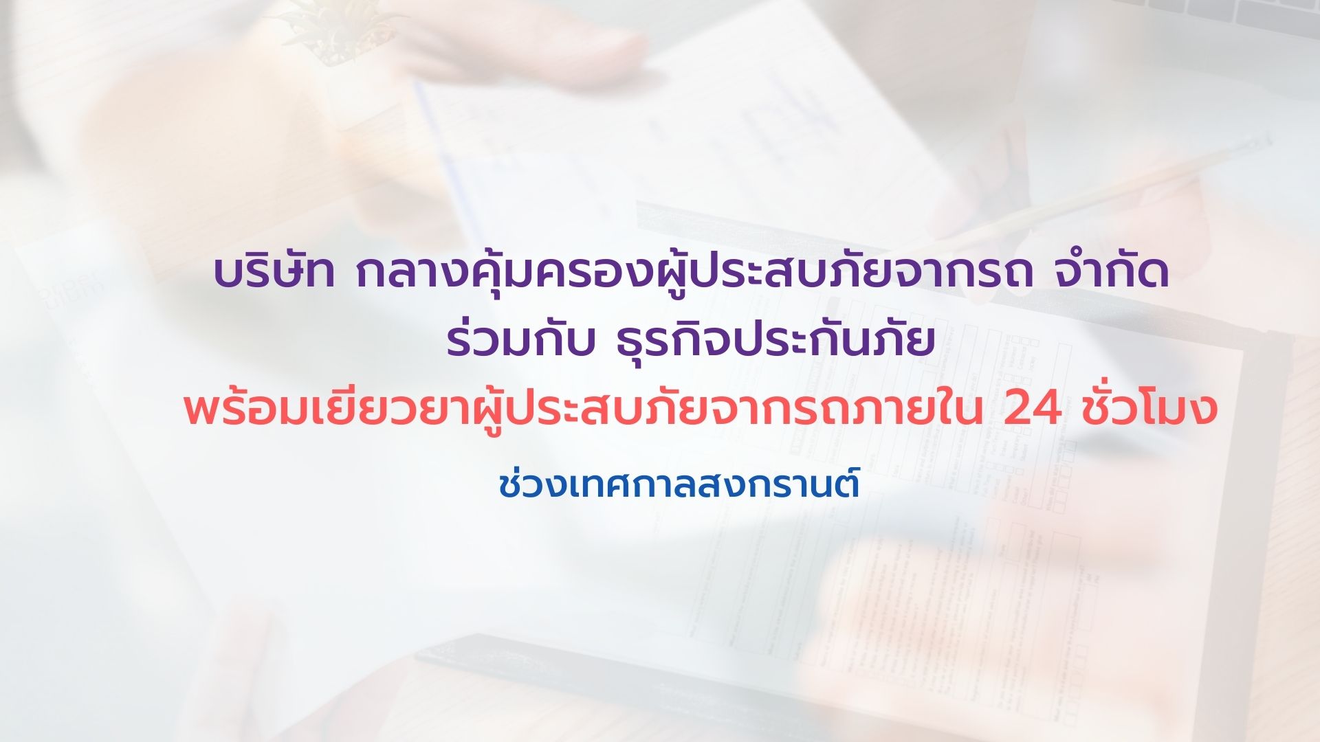 12 เมษายน 2565 : “ชีวิตวิถีใหม่ ขับขี่อย่างปลอดภัย ไร้อุบัติเหตุ” บริษัท กลางคุ้มครองผู้ประสบภัยจากรถ จำกัด ร่วมกับธุรกิจประกันภัยพร้อมเยียวยาผู้ประสบภัยจากรถภายใน 24 ชั่วโมง ช่วงเทศกาลสงกรานต์ 2565 ในช่วงเทศกาลสงกรานต์นี้ ตั้งแต่วันที่ 11 – 17 เมษายน 2565 ผู้ประสบอุบัติเหตุทางถนนและรถคันที่เกิดอุบัติเหตุมีการทำประกันภัย พ.ร.บ.ผู้ประสบภัยจากรถที่ได้บาดเจ็บหรือเสียชีวิตทุกคนจะได้รับความคุ้มครองตามกฎหมาย