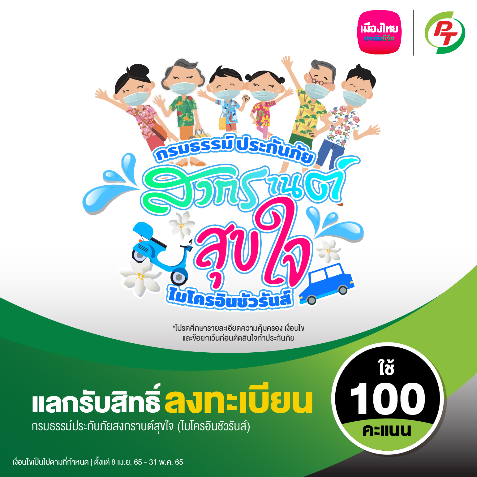 · สมาชิก PT Max Card ใช้ 100 คะแนน รับสิทธิ์ลงทะเบียนกรมธรรม์ประกันภัยสงกรานต์สุขใจ (ไมโครอินชัวรันส์) ผ่านแอปพลิเคชัน PT Max Rewards (ไม่จำกัดสิทธิ์ / สมาชิก ซึ่งผู้รับความคุ้มครองต้องไม่ใช่บุคคลเดียวกัน)