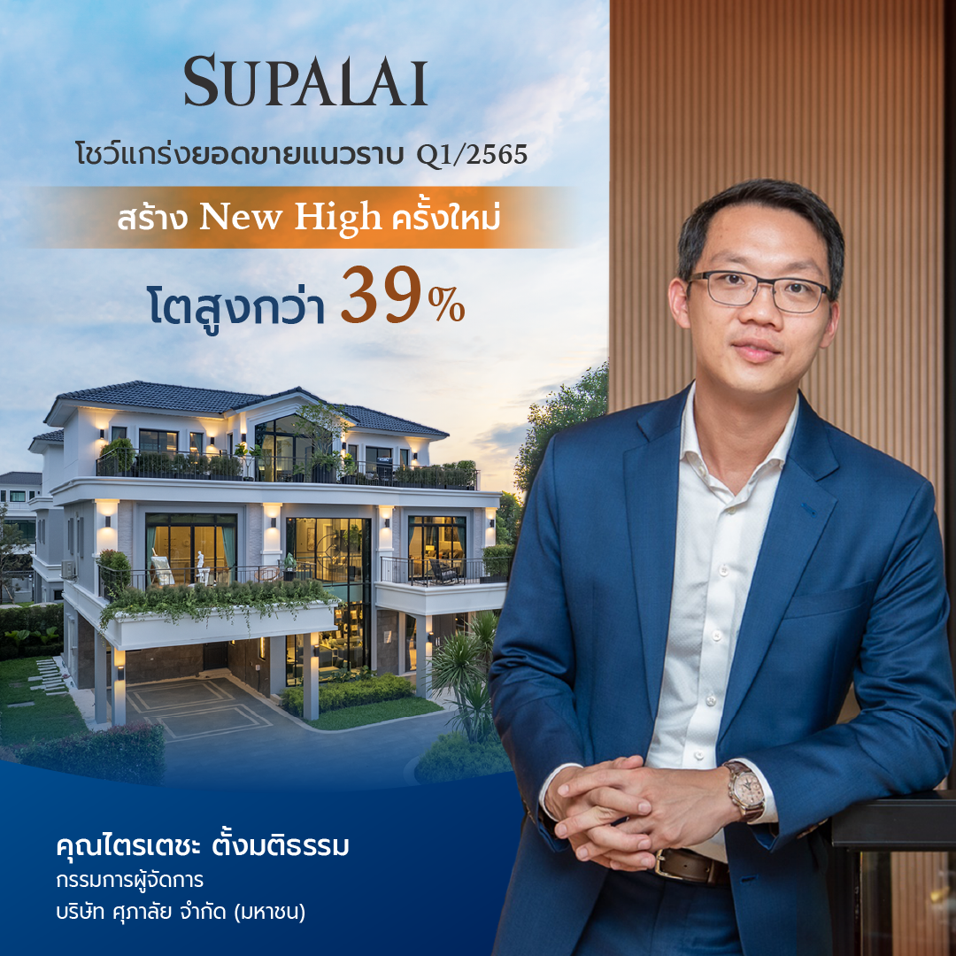 18 เมษายน 2565 : นายไตรเตชะ ตั้งมติธรรม กรรมการผู้จัดการ บริษัท ศุภาลัย จำกัด (มหาชน) กล่าวว่า ไตรมาสแรกของ ปี 2565 ที่ผ่านมา บริษัทฯ ได้สร้างปรากฏการณ์ครั้งสำคัญด้านยอดขายที่มีตัวเลขเติบโตอย่างแข็งแกร่ง โดยมีปัจจัยบวกจากการพัฒนาด้านกลยุทธ์การขาย เพิ่มสินค้าใหม่และสร้างความแตกต่าง การบริหารจัดการให้มีสินค้าพร้อมขาย รวมถึงการโอนกรรมสิทธิ์อย่างต่อเนื่อง