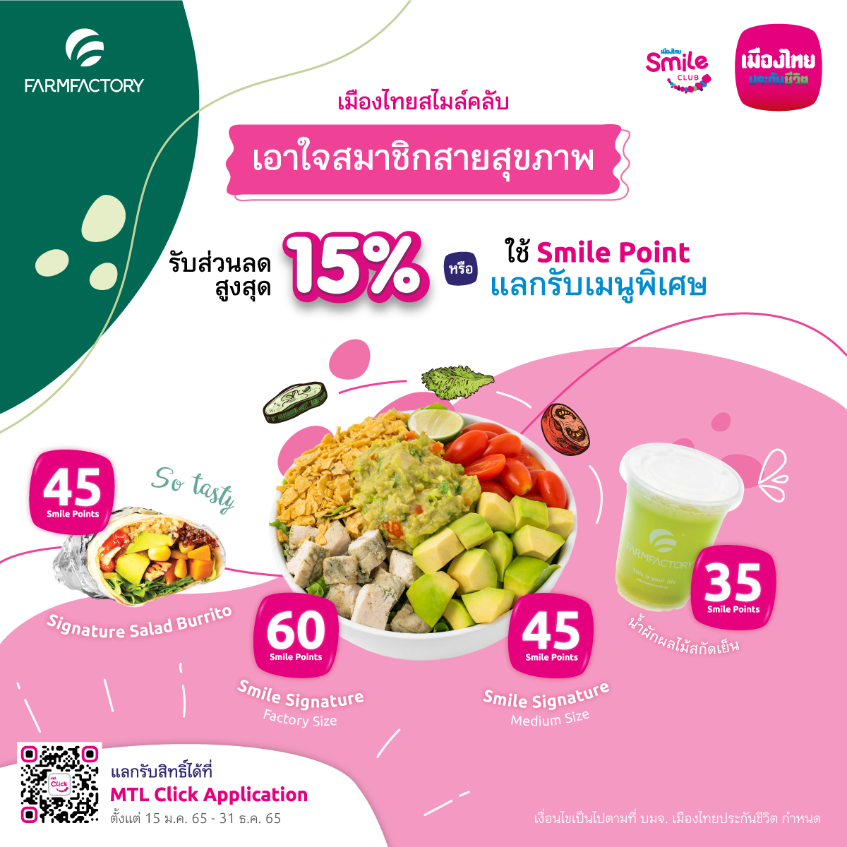 ด้าน Farmfactory มื้อสลัดสุขภาพคุณภาพดีที่ทางร้านจัดเต็มเมนูสลัดผักพร้อมวัตถุดิบเครื่องเคียงที่ส่งตรงจากฟาร์มและน้ำสลัดสูตรเฉพาะที่ทางร้านรังสรรค์มาเพื่อให้ถูกปากรสชาติคนไทย อีกทั้งยังมีเมนูน้ำผักผลไม้สกัดเย็นเครื่องดื่มสุขภาพที่ดีต่อร่างกาย ให้สมาชิกฯ สามารถเข้าถึงการดูแลสุขภาพแบบๆ ง่าย โดยใช้คะแนนสะสมเริ่มต้นที่ 35 Smile Points แลกรับน้ำผักผลไม้สกัดเย็น และพิเศษ! รับส่วนลดสูงสุด 15% เมื่อซื้อเมนูสลัดและเครื่องดื่ม ครบ 1,000 บาท (สามารถรับสิทธิ์ได้ที่หน้าร้านเท่านั้น)