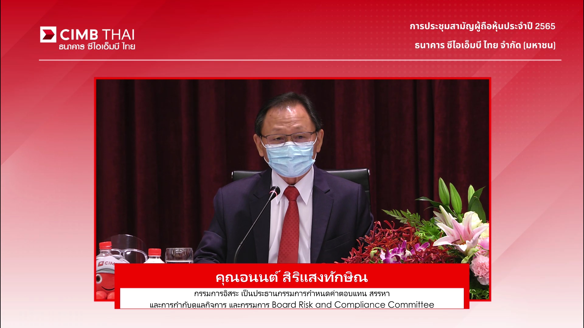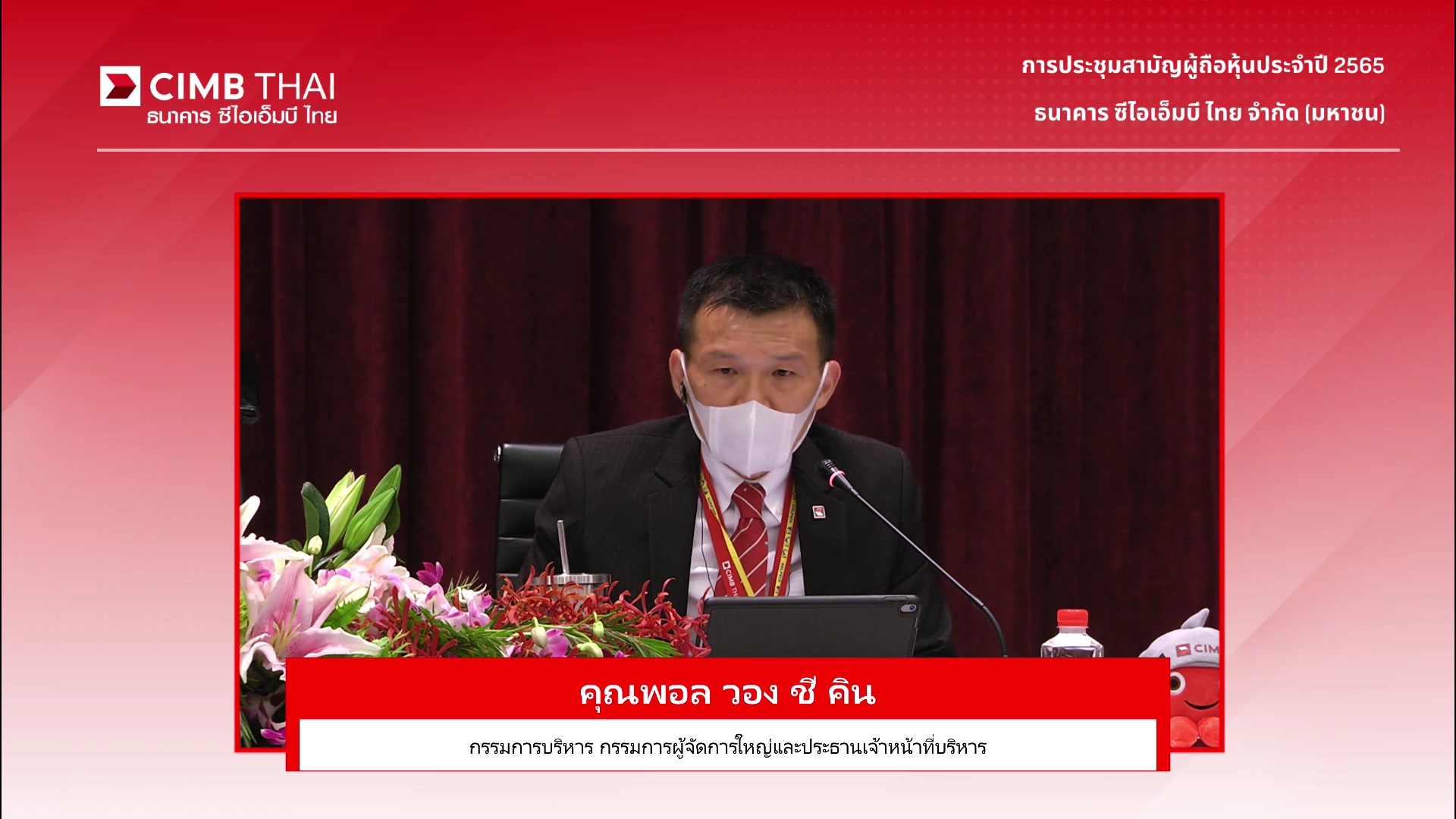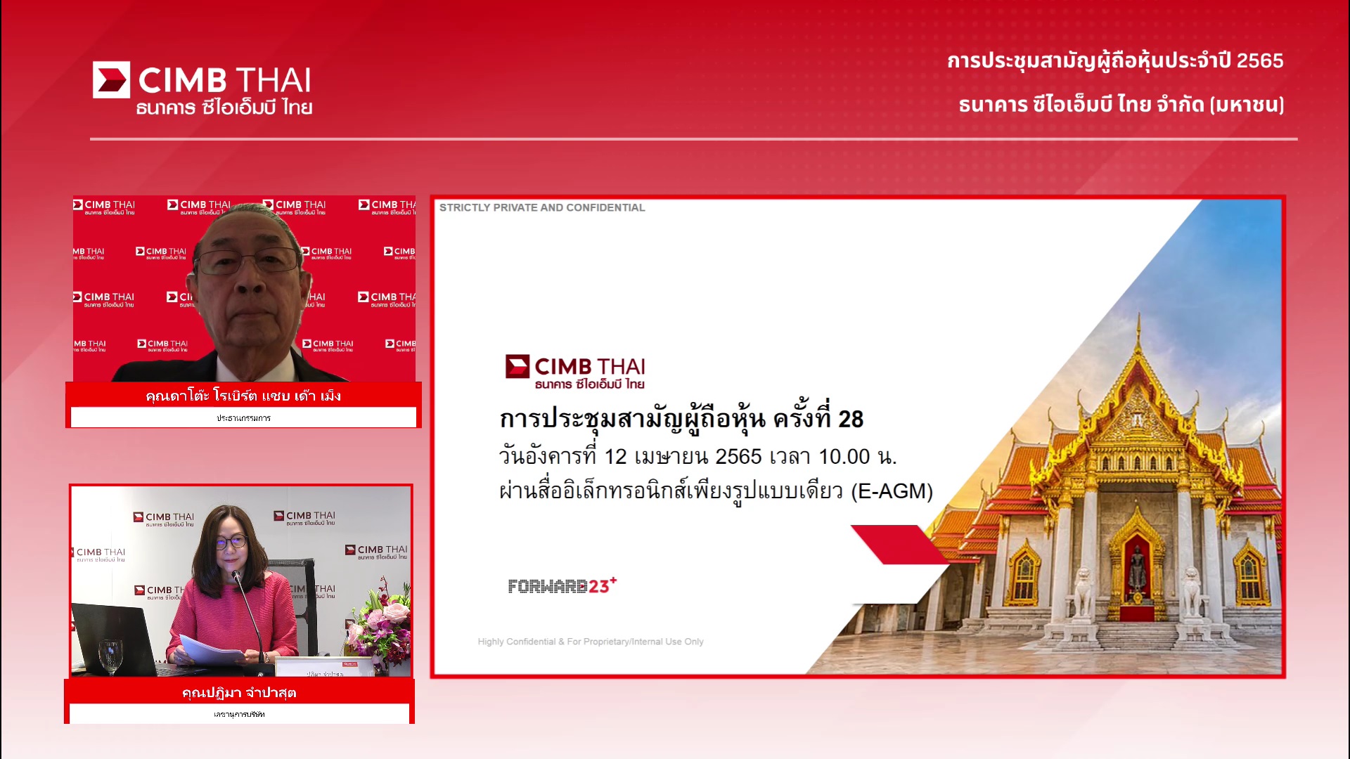 19 เมษายน 2565 : ธนาคาร ซีไอเอ็มบี ไทย จัดการประชุมสามัญผู้ถือหุ้น ครั้งที่ 28 เมื่อวันที่ 12 เม.ย. 65 โดยถ่ายทอดสดการประชุมผ่านสื่ออิเล็กทรอนิกส์ จากห้องออดิทอเรียม สำนักงานใหญ่ ถนนหลังสวน เวลา 10.00 น. นำประชุมโดย ดาโต๊ะ โรเบิร์ต แชบ เด๊า เม็ง ประธานกรรมการ อนนต์ สิริแสงทักษิณ กรรมการอิสระ และประธานกรรมการกำหนดค่าตอบแทน สรรหา และการกำกับดูแลกิจการ และพอล วอง ชี คิน กรรมการผู้จัดการใหญ่และประธานเจ้าหน้าที่บริหาร