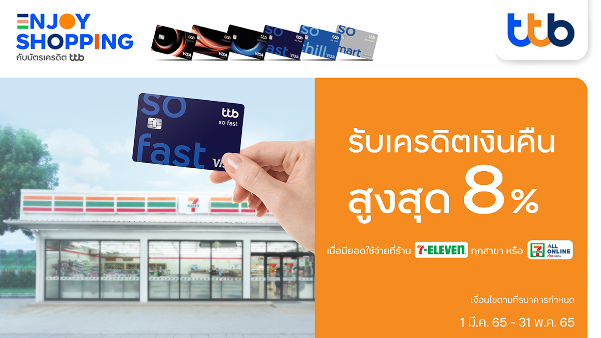 25 เมษายน 2565 : บัตรเครดิต ทีทีบี ร่วมกับ 7-ELEVEN มอบสิทธิพิเศษสำหรับลูกค้าคนสำคัญของบัตรเครดิต ทีทีบี ได้เพลิดเพลินกับการใช้จ่ายภายในร้านสะดวกซื้อ 7-ELEVEN ทุกสาขา หรือสั่งซื้อสินค้าผ่านทาง ALL Online by 7-ELEVEN รับเครดิตเงินคืนสูงสุด 8% ตั้งแต่วันนี้ถึง 31 พฤษภาคม 2565 ทั้งนี้ เมื่อมียอดใช้จ่ายสะสมตลอดรายการครบทุก 1,500 บาท รับเครดิตเงินคืน 120 บาท โดยลงทะเบียนเพื่อรับเครดิตเงินคืนพิมพ์ TSV ตามด้วยหมายเลขบัตรเครดิต 12 หลักสุดท้าย ส่งมาที่ 4806026
