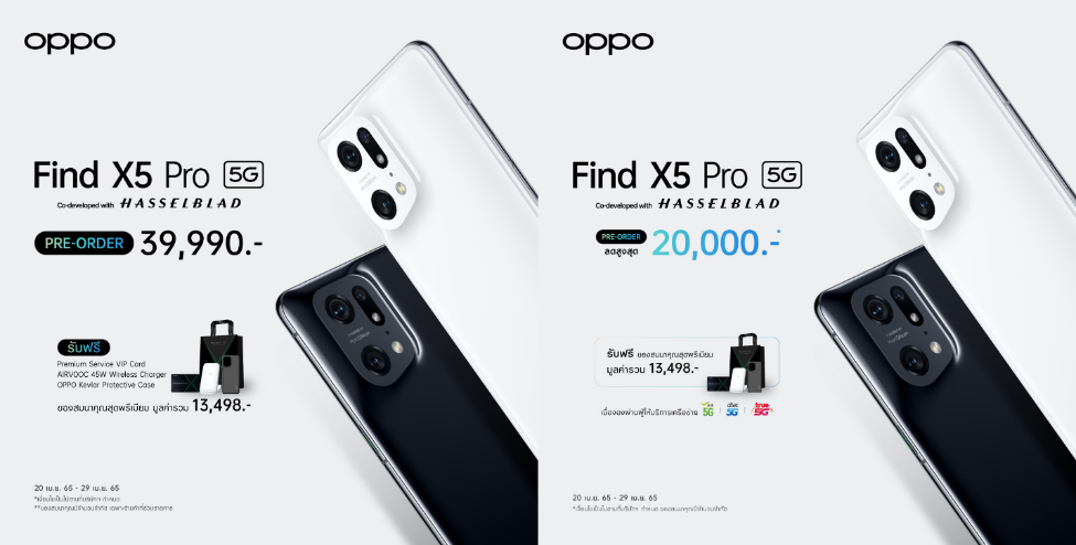 OPPO Find X5 Pro 5G สมาร์ตโฟนแฟลกชิปรุ่นล่าสุดนี้มาใน 2 สี ได้แก่ สีขาว Ceramic White และสีดำ Glaze Black วางจำหน่ายในราคา 39,990 บาท สามารถพรีออเดอร์ได้ตั้งแต่วันนี้ – 29 เมษายน 2565 พร้อมรับของสมนาคุณ Premium Box Set มูลค่า 13,498 บาท ได้แก่ Premium Service VIP Card ประกันหน้าจอแตก มูลค่า 10,000 บาท, AIRVOOC 45W Wireless Charger 2,499 บาท และ OPPO Kevlar Protective Case มูลค่า 999 บาท
