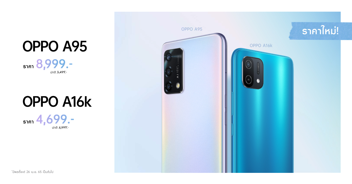 26 เมษายน 2565 : OPPO A95 สุดยอดสมาร์ตโฟนให้คุณสมาร์ทไปให้สุดฟอร์ม พร้อมให้คุณได้พบกับความสนุกได้ง่ายยิ่งขึ้น พร้อมตอบโจทย์ทุกการใช้งานในราคาใหม่เพียง 8,999 บาท และ OPPO A16k ในราคาใหม่เพียง 4,699 บาท ตั้งแต่วันที่ 26 เมษายน 2565 เป็นต้นไป