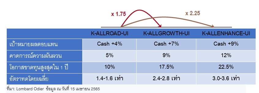 3. กำหนดเป้าหมายได้ตามความเสี่ยง ผ่าน 3 กองทุน คือ K-ALLROAD-UI, K-ALLGROWTH-UI และ K-ALLENHANCE-UI ซึ่งมีความแตกต่างกันตามระดับความเสี่ยงที่ยอมรับได้