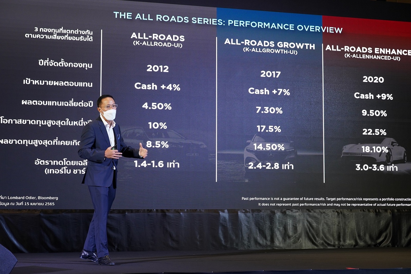 ซึ่งครั้งนี้เราได้นำนวัตกรรมการลงทุนระดับโลกเสนอแก่ลูกค้าบุคคลสินทรัพย์สูงเป็นครั้งแรกในประเทศไทยผ่าน 3 กองทุนภายใต้ K-ALLROAD Series ได้แก่ K-ALLROAD-UI, K-ALLGROWTH-UI และ K-ALLENHANCE-UI ที่มาพร้อมสัดส่วนการลงทุนที่เหมาะสม ควบคู่กับกลไกบริหารจัดการให้ความเสี่ยงของพอร์ตให้อยู่ในกรอบที่กำหนดไว้ และสามารถสร้างผลตอบแทนได้ในทุกสภาพเศรษฐกิจ โดยที่นักลงทุนไม่ต้องจัดการใดๆ ในขณะที่ผู้จัดการกองทุนทำหน้าที่เพียงล็อคเป้าหมายและปรับตามสถานการณ์ เปรียบได้กับยานยนต์อเนกประสงค์อัจฉริยะที่มีระบบขับเคลื่อนได้ด้วยตัวเอง (Self-Driving Mode) และพร้อมรับมือกับทุกสภาพถนนได้อย่างมีประสิทธิภาพ