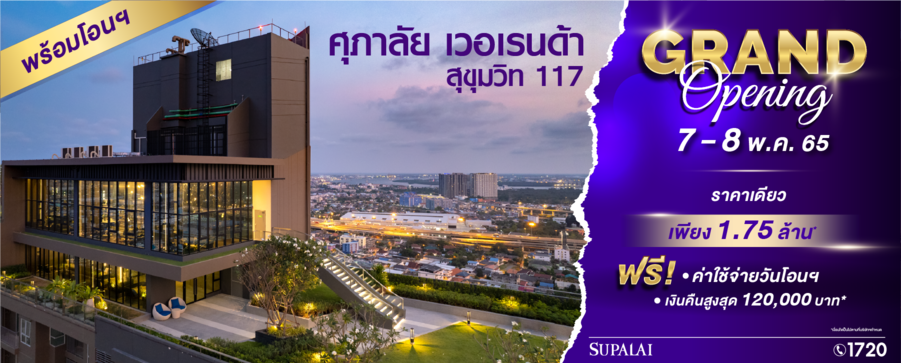 สามารถเป็นเจ้าของคอนโดฯ บนทำเลยอดฮิต ติดรถไฟฟ้า “ศุภาลัย เวอเรนด้า สุขุมวิท 117” ได้ก่อนใครที่งาน “Grand Opening” ในวันที่ 7 – 8 พฤษภาคม 2565 ณ Sales Gallery เมื่อจองภายในงานพบข้อเสนอสุดพิเศษราคาเดียว 1.75 ล้านบาท* ฟรี ! ค่าใช้จ่ายวันโอนฯ, ค่าส่วนกลาง และรับเงินคืนสูงสุด 120,000 บาท* (*เงื่อนไขเป็นไปตามที่บริษัทฯ กำหนด) สามารถสอบถามข้อมูลเพิ่มเติมได้ที่ โทร.1720 หรือดูรายละเอียดได้ที่ www.supalai.com หรือ Facebook : Supalai Society ![]()