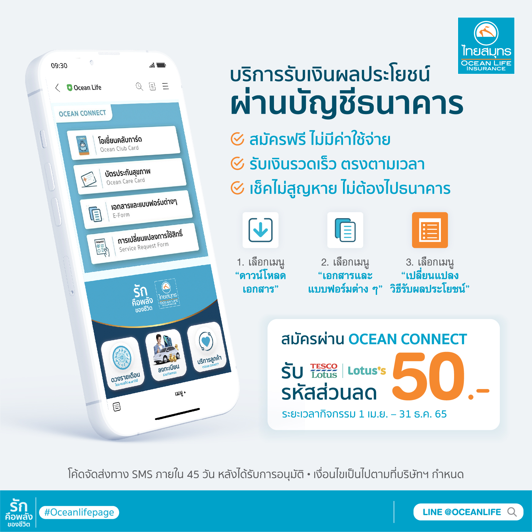 หมดปัญหาการไม่สะดวกมารับเช็ค หรือเช็คสูญหาย สามารถรับเงินได้รวดเร็ว ตรงตามเวลา แถมยังช่วยให้ลูกค้าหลีกเลี่ยงการพบปะผู้คนและลดความเสี่ยงจากการเดินทางในช่วงสถานการณ์ COVID-19 ระบาดอีกด้วย โดยสามารถสมัครรับ “บริการรับเงินผลประโยชน์ ผ่านบัญชีธนาคาร หรือ Direct Pay” ได้แล้ววันนี้ โดยลงทะเบียน OCEAN CONNECT ผ่าน Line @Oceanlife พิเศษสุด! สมัครตั้งแต่วันนี้ – 31 ธันวาคม 2565 รับรหัสส่วนลด Tesco Lotus มูลค่า 50 บาทไปเลย